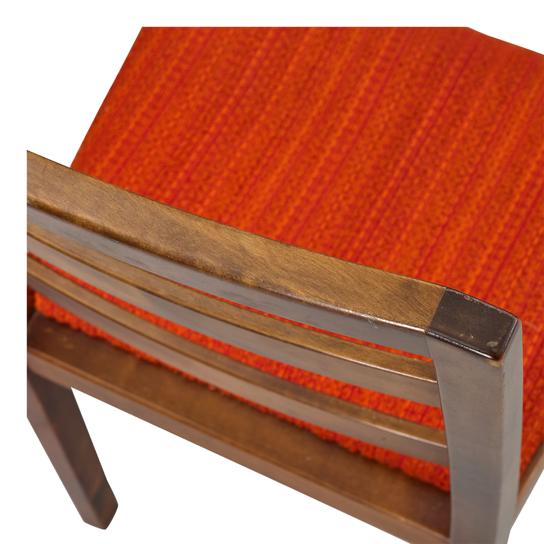 Nils Öfverman (1888-1957) was a core in-house architect for Sweden’s most influential furniture workshop (Nordiska Kompaniet) during the 1910s–30s, working alongside Axel Einar Hjorth and Carl Bergsten. This pair of "Bengt" chairs were designed in the 1920s to be simplified, modernized “everyday classics” - elegant yet affordable. Solid birchwood framing and a ladder back using exotic wood. Classic orange upholstery. Sold individually, pair available.