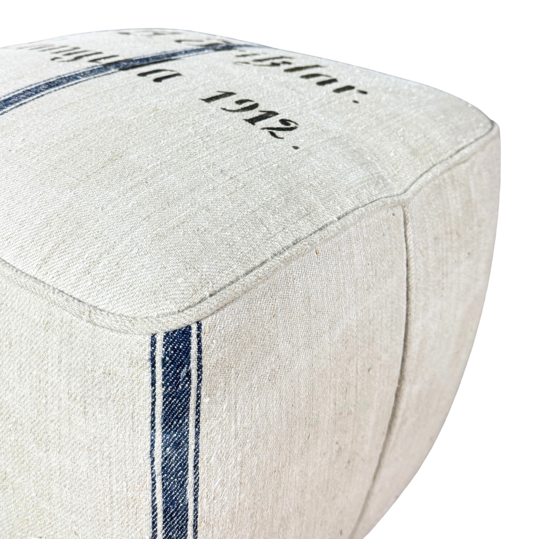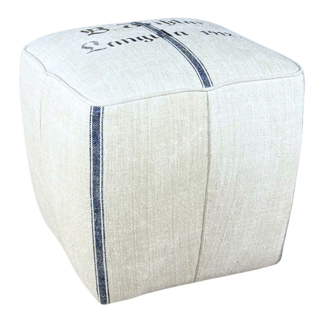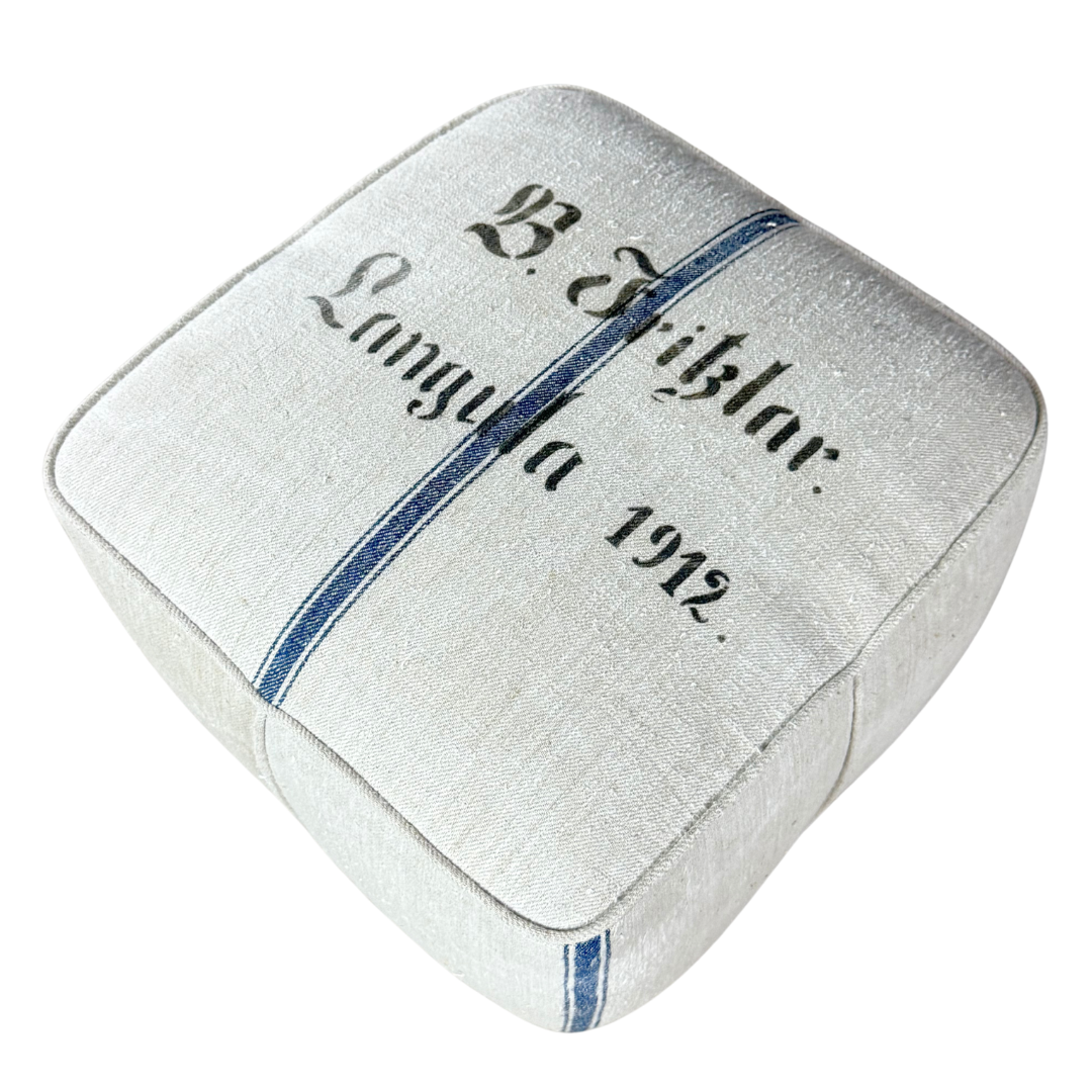 One of the most celebrated of the early modernist Czech designer with strong Art Deco and Bauhaus influences. This 1930s footstool / tabouret / ottoman has a terrific vintage upholstery over a tapered square form, recently upholstered in a vintage German grain sack. Set of centered wood feet make a wonderful design statement. Produced by UP Závody in Brno in Czech, 1930s.
