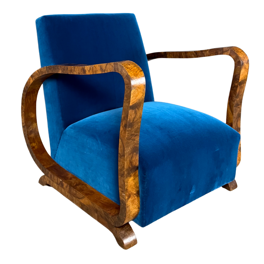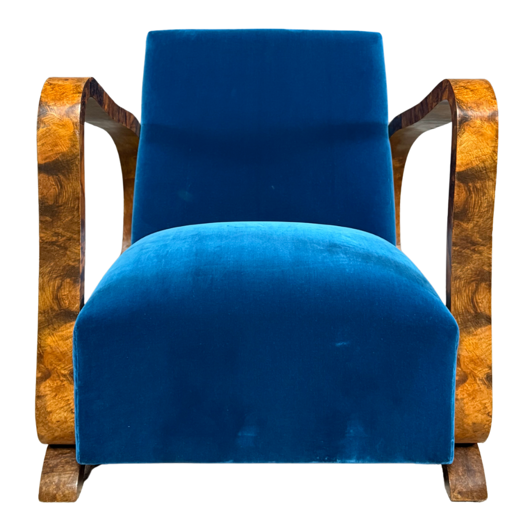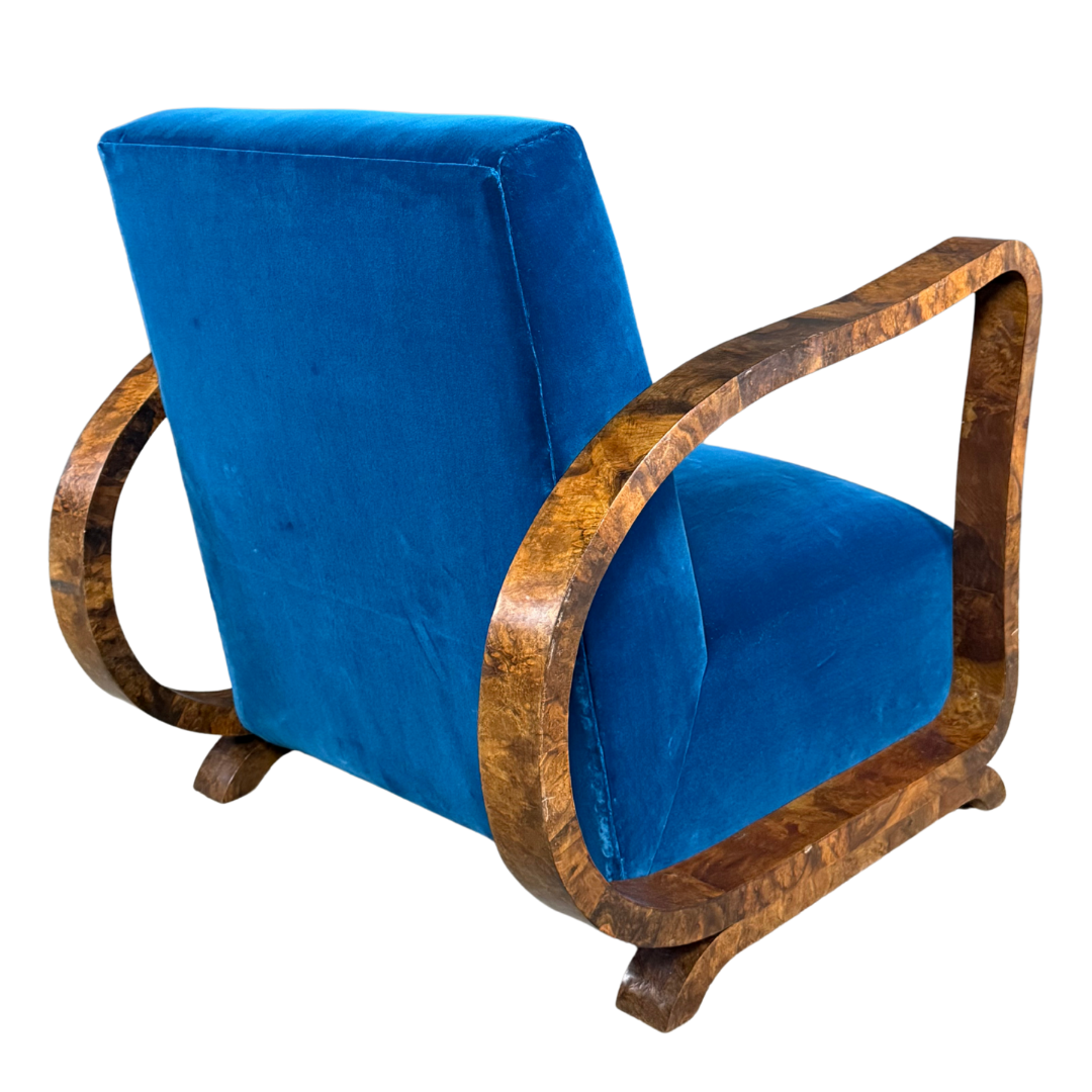 An exceptional pair of lounge chairs from the 1920s to 1930s with a continuous, flowing arm-to-leg structure that is a hallmark of Art Deco and early modernist bentwood designs. Frames veneered in a highly figured walnut grain with a rich amber-brown coloration. Recently updated in a striking blue velvet. The refined nature and quality of the design point to a Viennese Secessionist lineage. Just gorgeous.