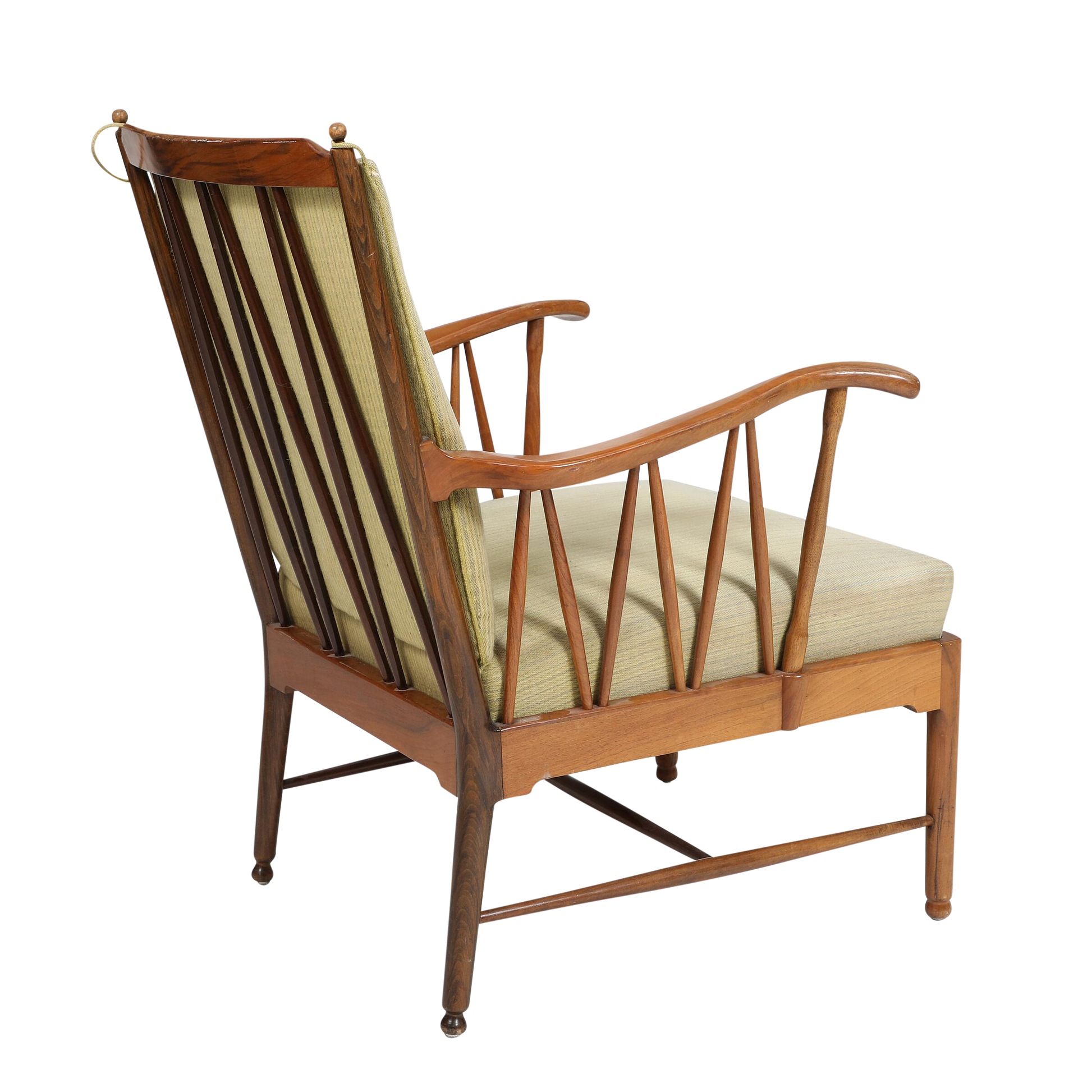 An unusual chair design from the 1940s - either Danish or Swedish small carpentry shop - produced during a time when traditional rural forms were revived using a softer design pallet. A solid mahogany base with slender legs terminating in diminutive ball feet support generous seating and a tall back. Sculpted arms in solid walnut. The most interesting feature is the tapered spindles that connect as a continued wave under the arms and along the back. Loose cushions in need of new upholstery. Priced as is... ready for your fabric choice.