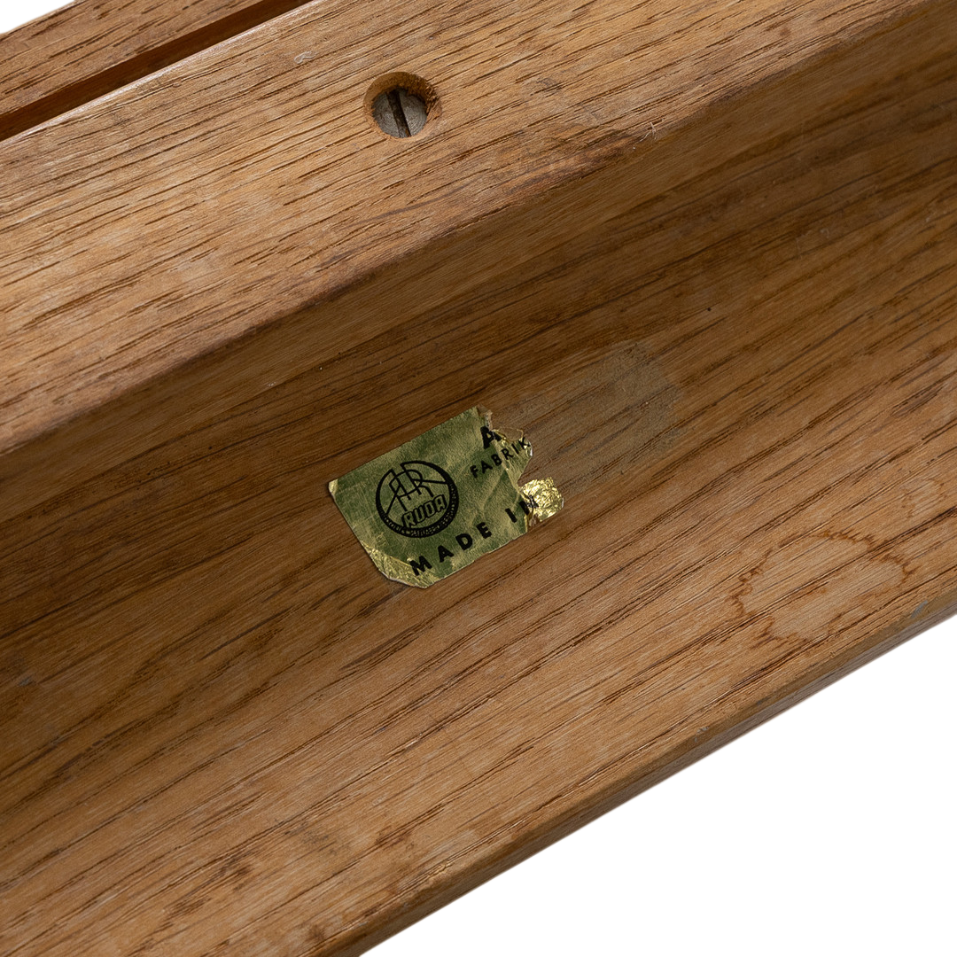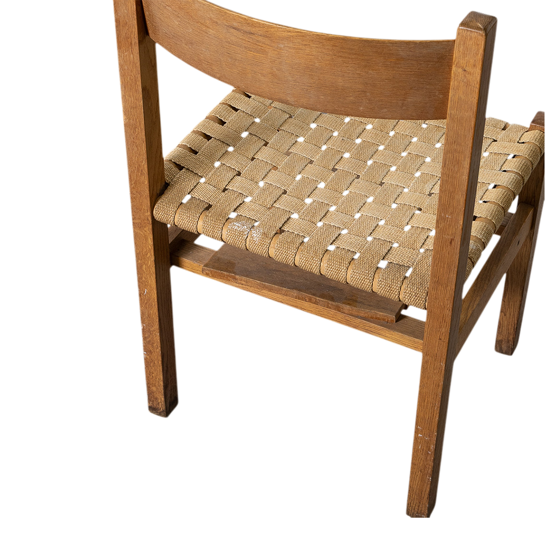 Andrées Fabriks AB was a noted Swedish mid-century manufacturer that often completed larger-scale school and institutional furniture projects, especially stackable seating. This classic Scandinavian utilitarian designed chair has a simple modernist solid oakwood frame with original woven linen strap seating and a small underlying shelf for books. Produced at their factory starting in the 1950s in Ruda, Sweden.