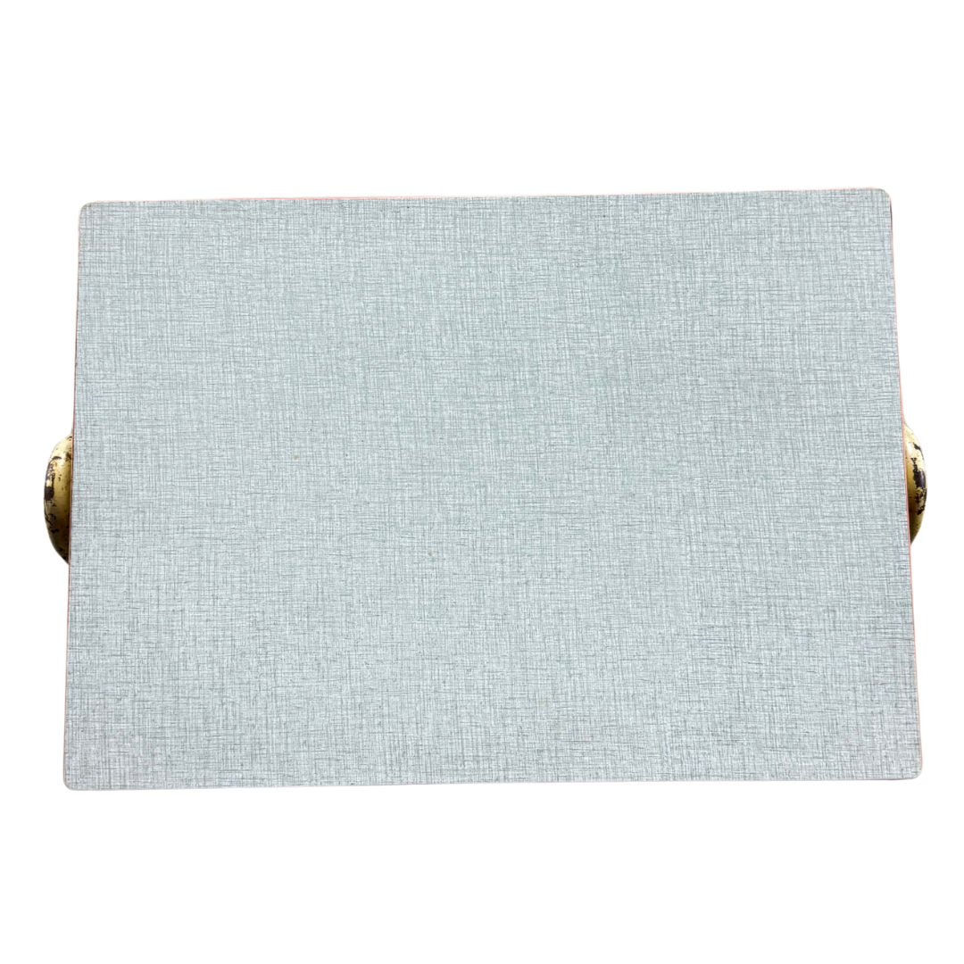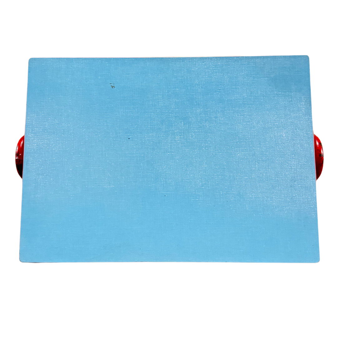 A wonderful and authentic example of mid-century French utilitarian design — the kind of small work or school table produced throughout the 1950s–1960s for classrooms, ateliers, and youth furniture programs in northern and eastern France. Bent tubular steel frame and table support is a lacquered red or yellow - which is repeated in the top trim for the beautiful light colored laminate/formica top.