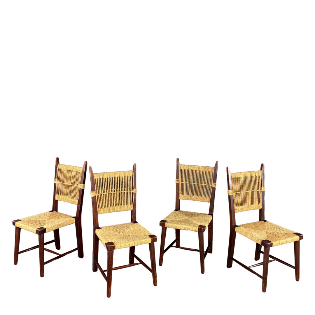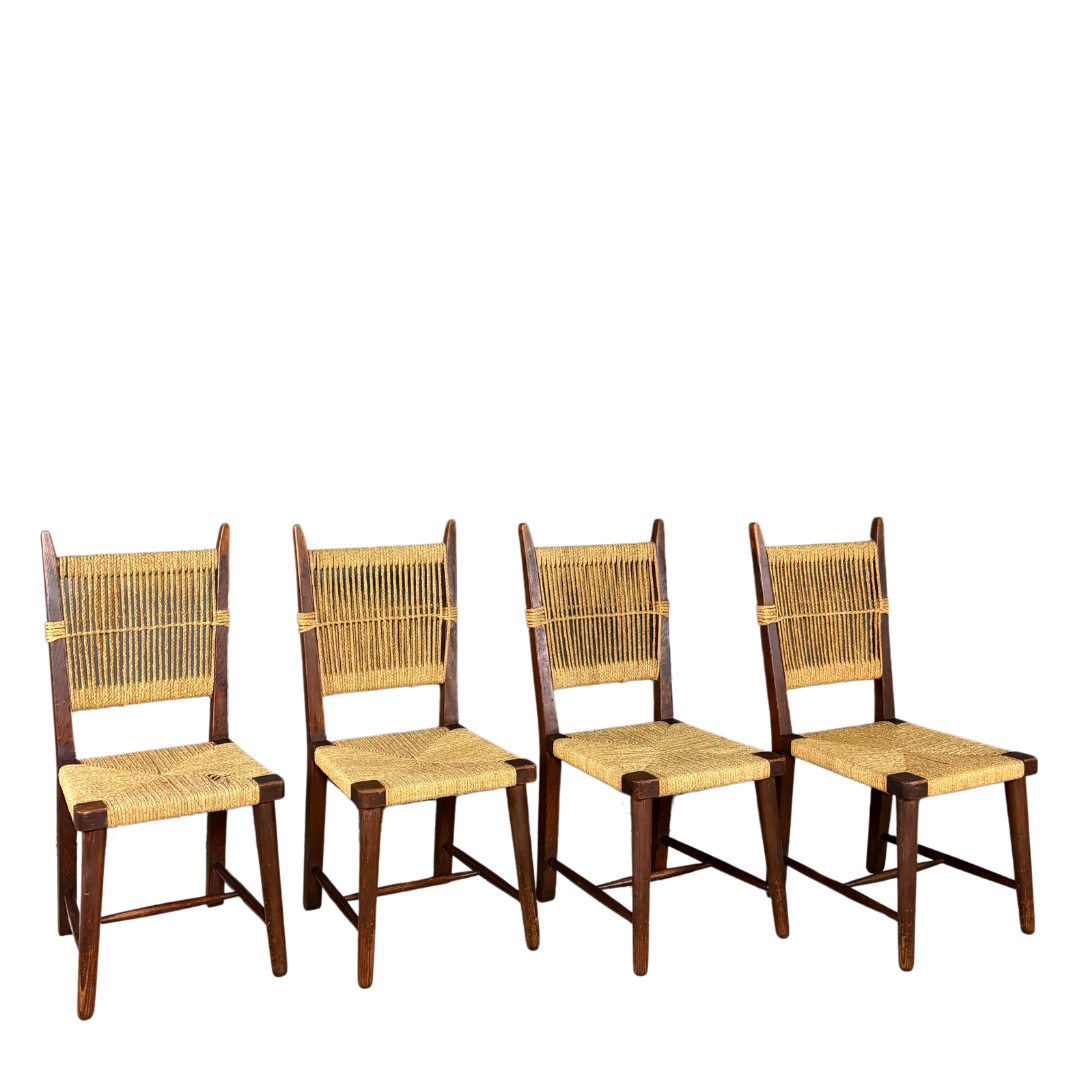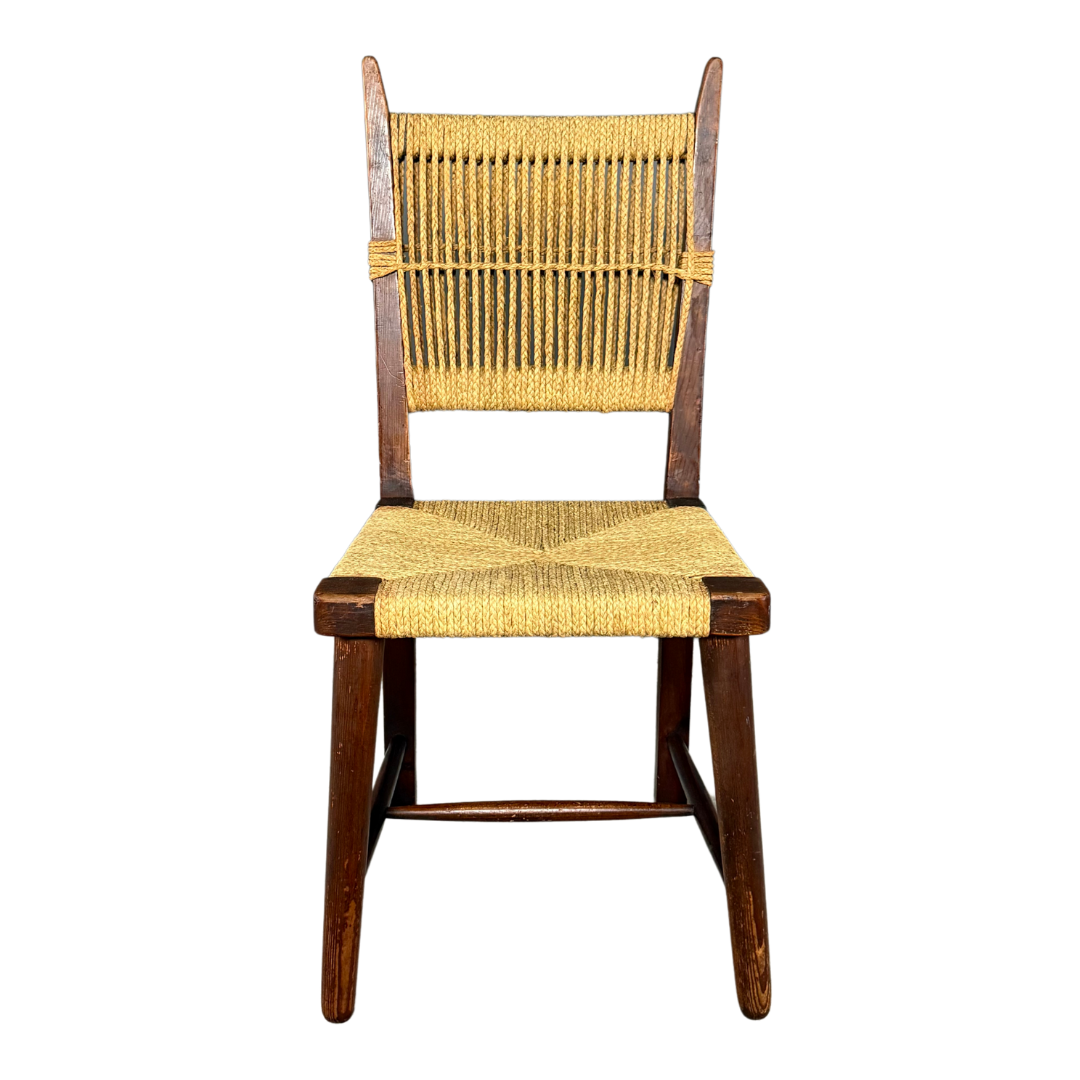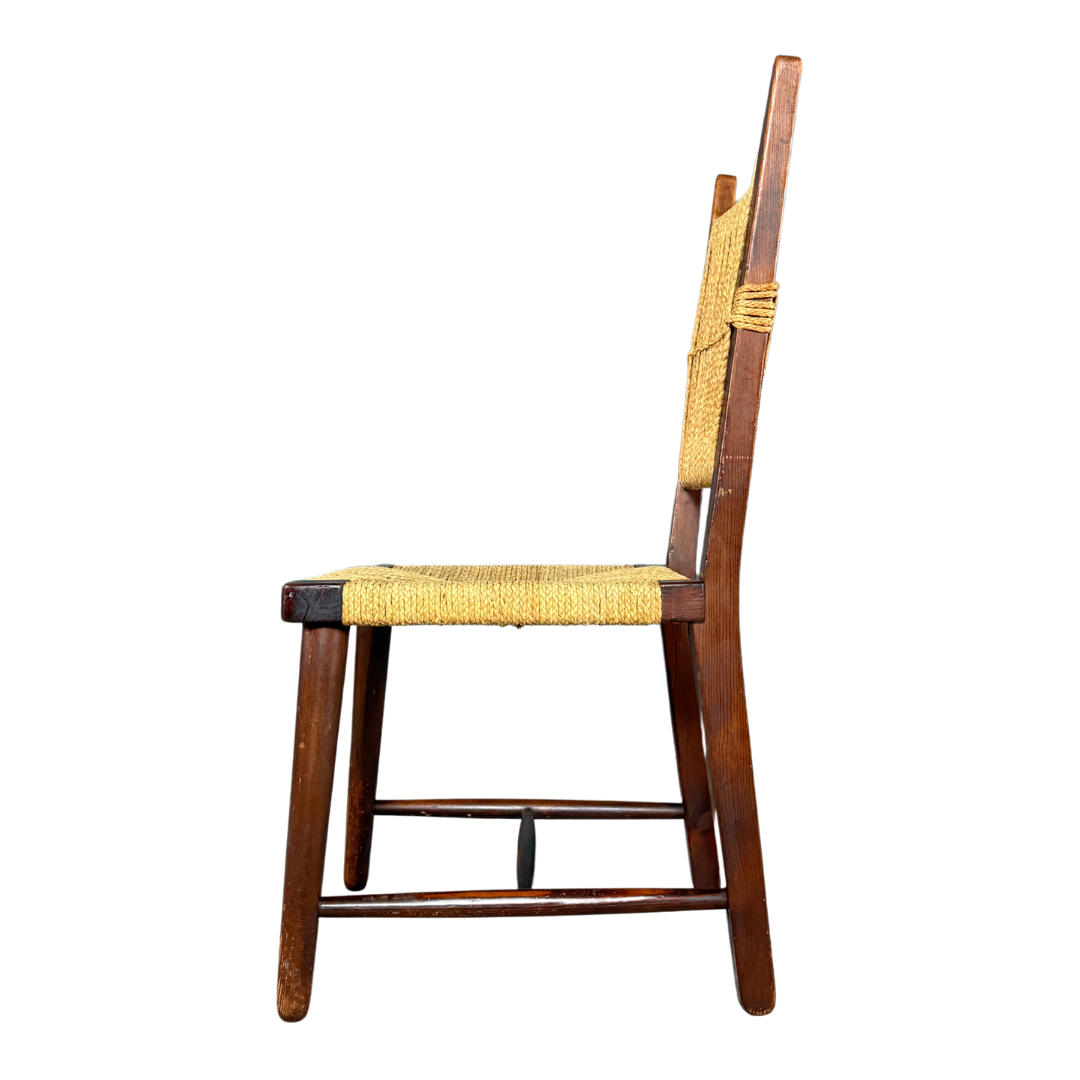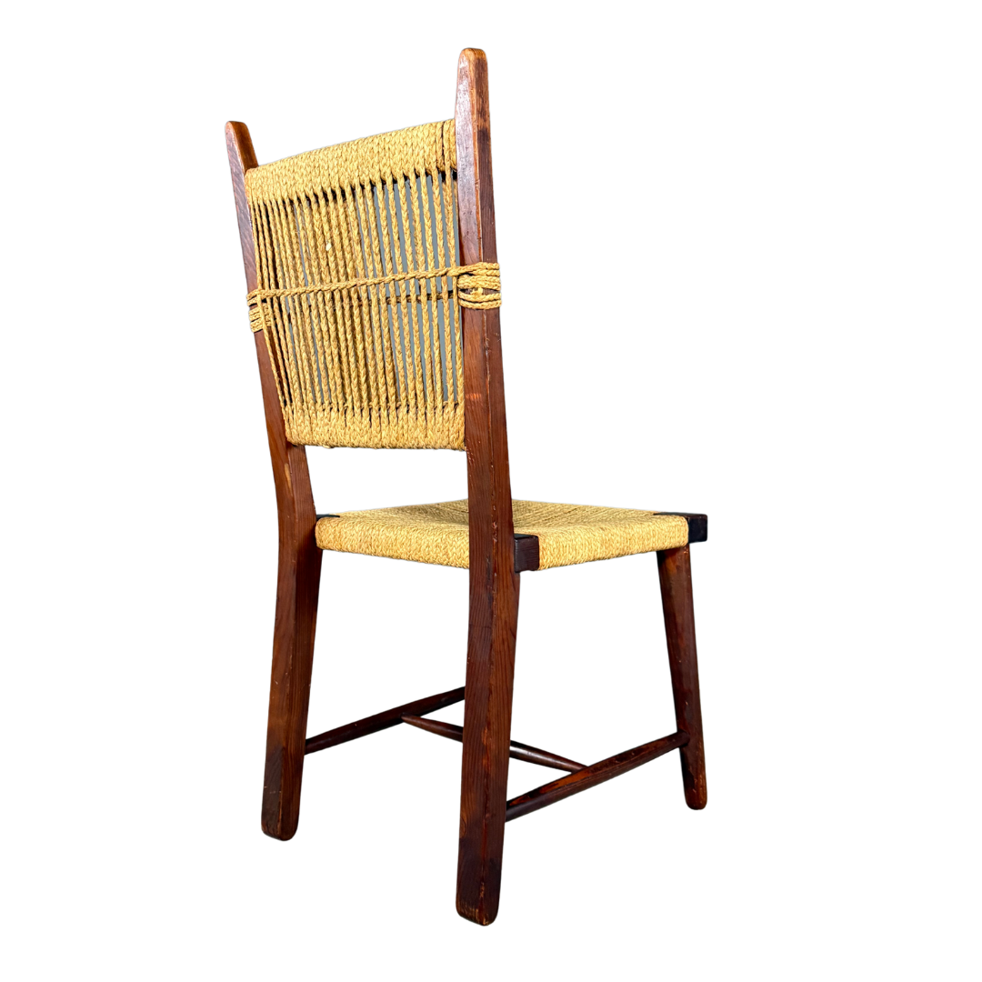 An unusual find in France that could be 1940s or 1950s with a very organic provincial viewpoint. Dark-stained slightly tapered legs have squared joinery with a central "I" dowel stretcher for support. Seat with a classic envelope weave in corded jute in very good condition. Unique backrest with horizontal bindings attached at top and bottom with a central design element that suggests a regional artisan workshop. Basque or Catalan design cannot be ruled out.