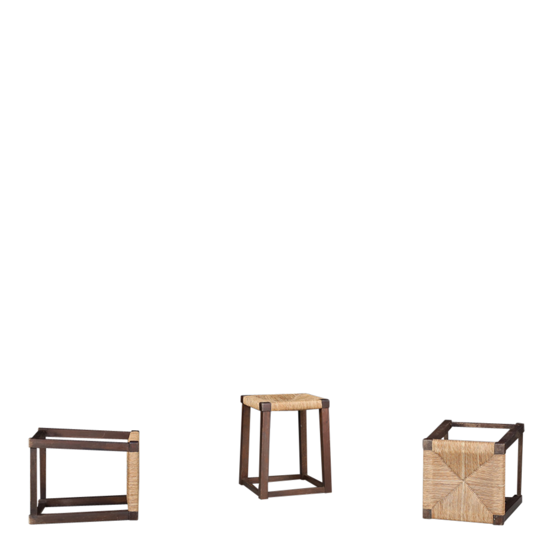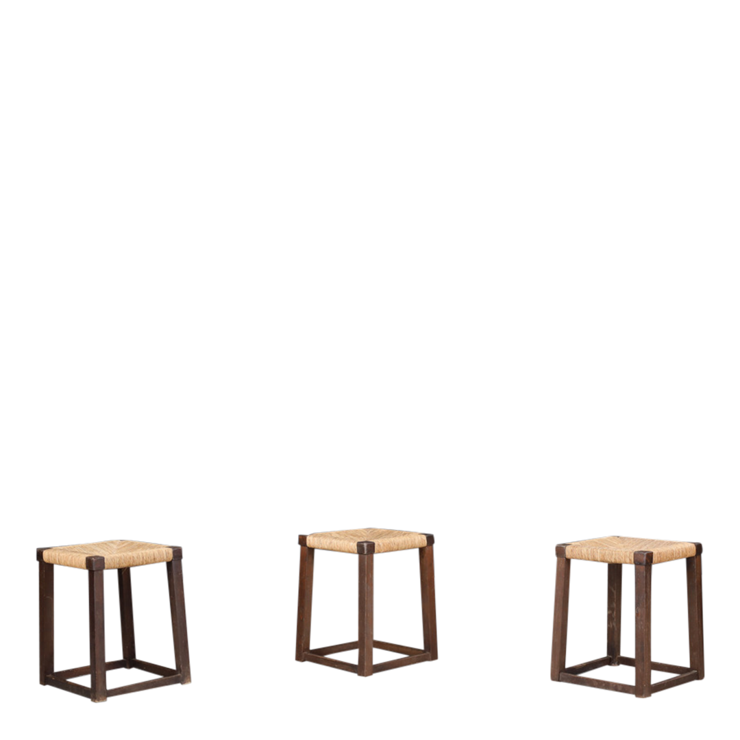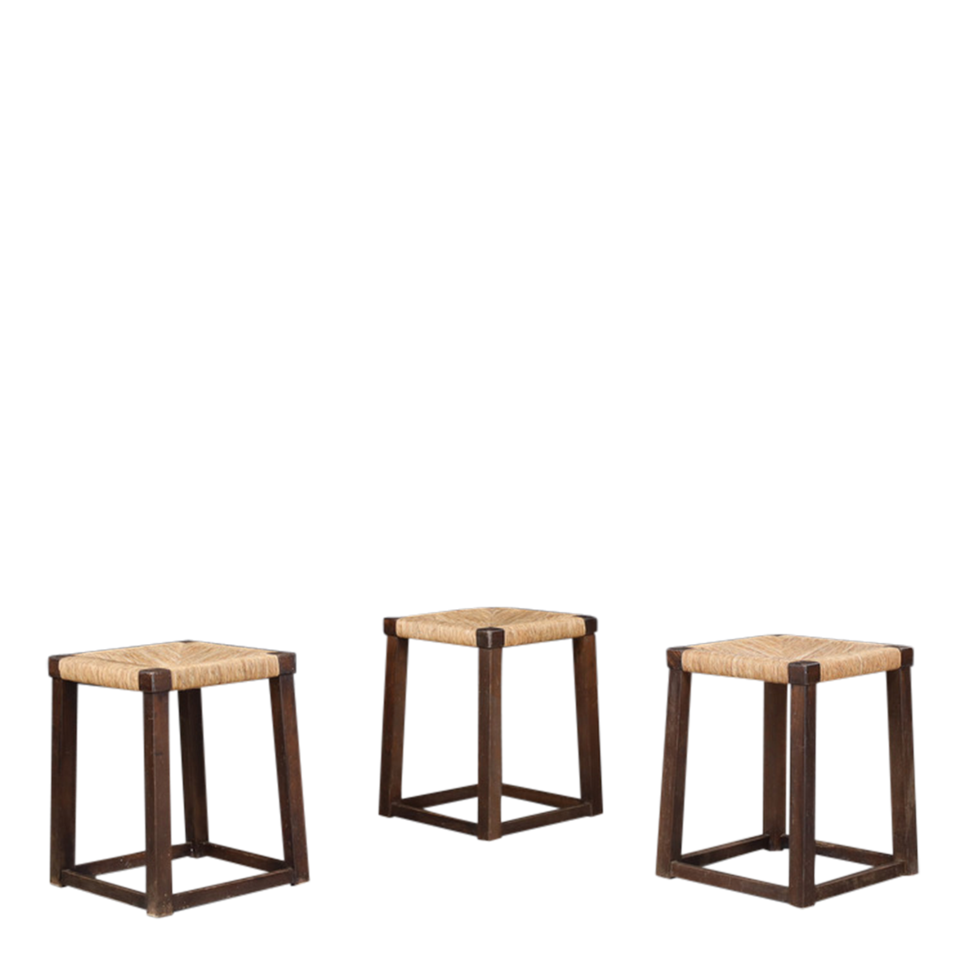 A perfect set of French provincial-style rustic stools from the 1950s rooted in centuries-old French vernacular design, reflecting the utilitarian craftsmanship of rural artisans. Square-form frame in solid oakwood with a gently tapered silhouette that adds stability. Tightly woven rush seating in a classic "French Star" pattern.