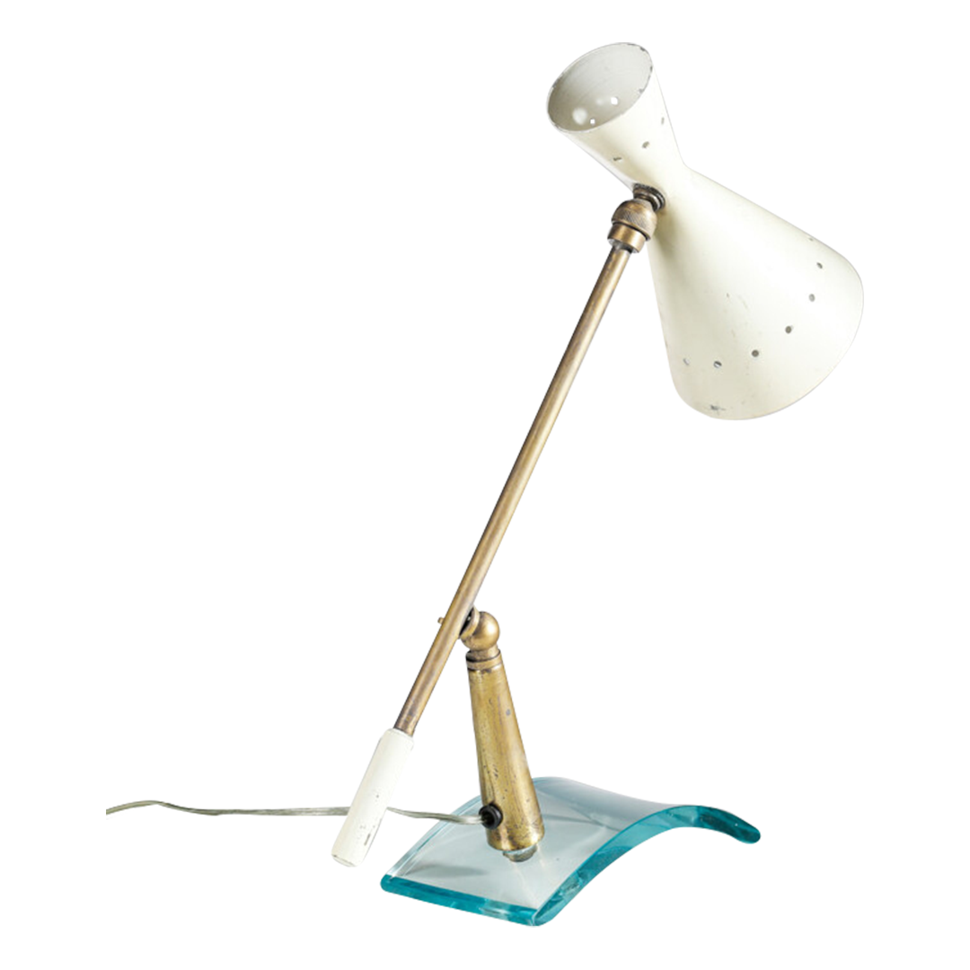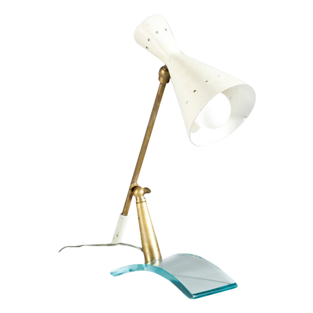 Classic Italian modernist design from the 1950s. White painted and corseted aluminum shade with top perforation is supported by an adjustable brass stem connected to a wider brass support. A beautiful blue tinted crystal form the glass base. Unknown Italian manufacture - not marked.