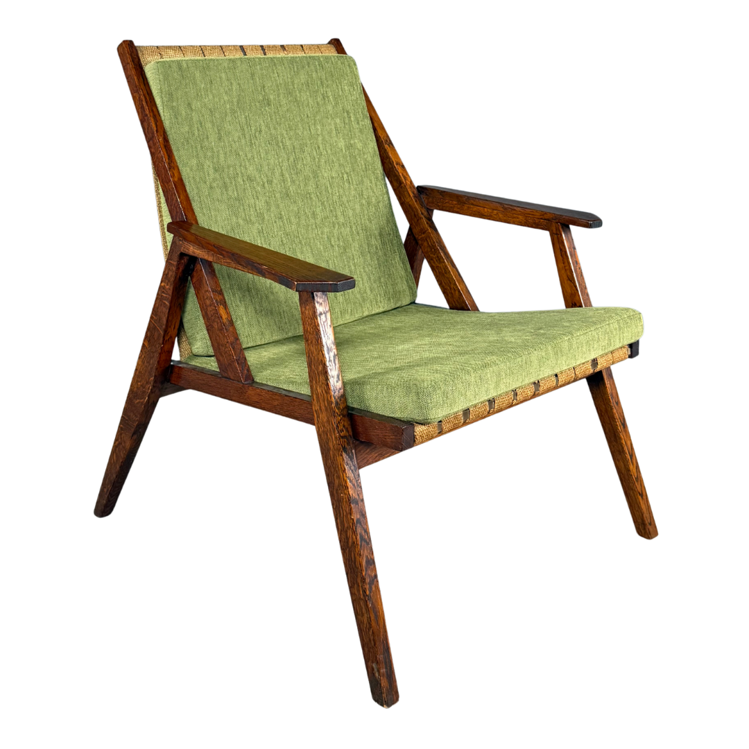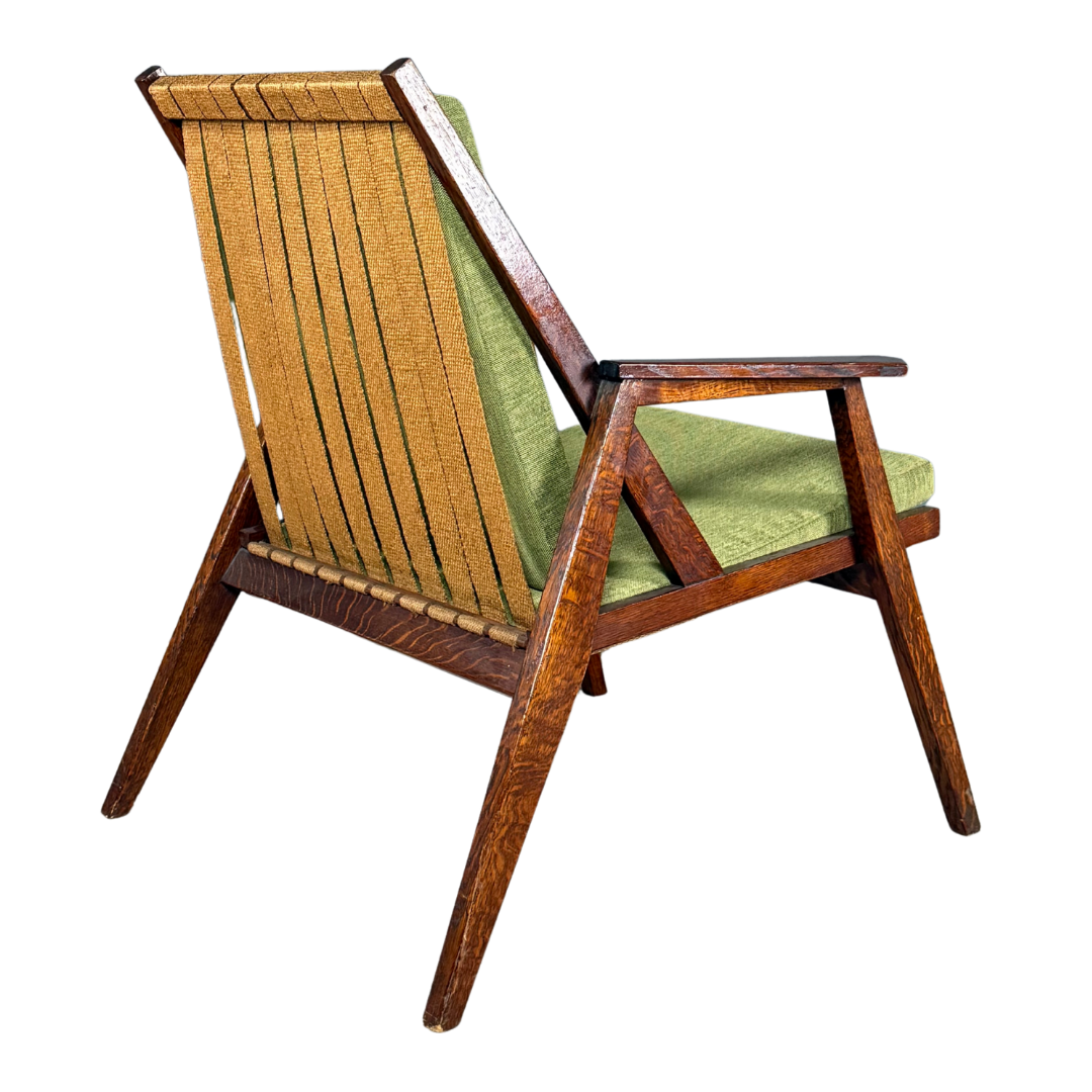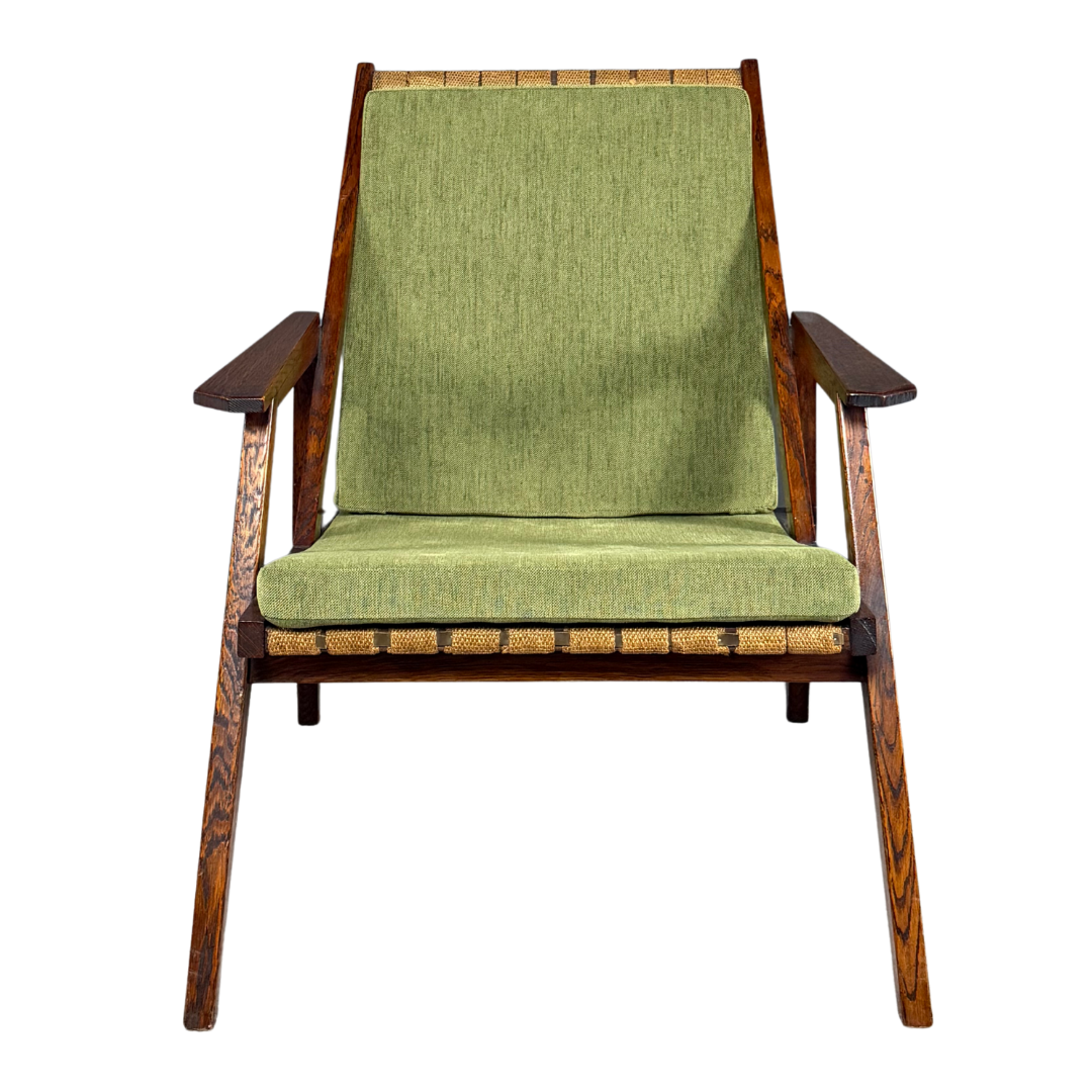 Miroslav Navrátil (1913-1999) is regarded as one of the fathers of modern Czech furniture design. This armchair is constructed using stained solid oak, with sharply angled front and back legs that create a striking, architectural profile. Original linen strapping and a lovely newly added forest green cushion keep this grounded in an otherwise modernist frame. Attributed to Miroslav Navrátil, Czech. Probably UP Závody Brno.