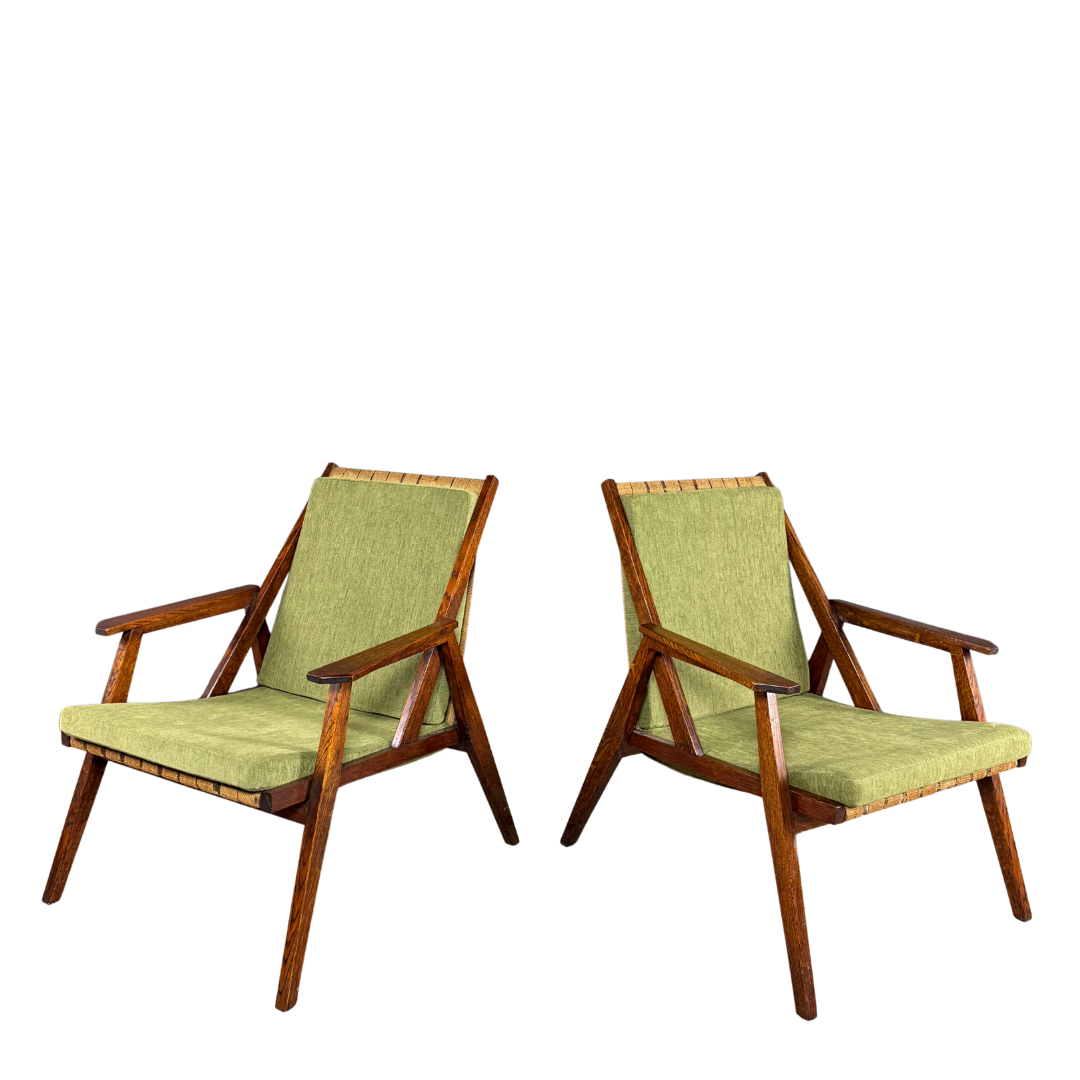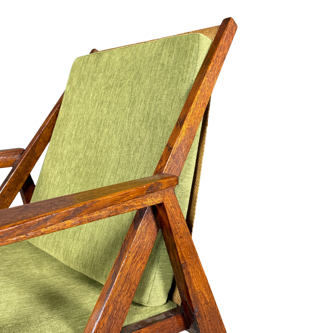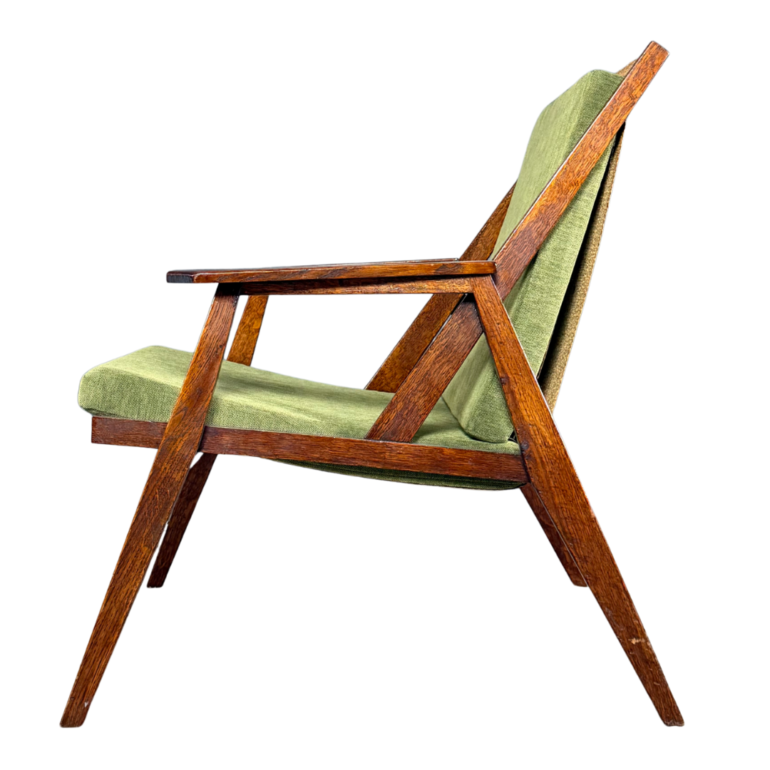Miroslav Navrátil (1913-1999) is regarded as one of the fathers of modern Czech furniture design. This armchair is constructed using stained solid oak, with sharply angled front and back legs that create a striking, architectural profile. Original linen strapping and a lovely newly added forest green cushion keep this grounded in an otherwise modernist frame. Attributed to Miroslav Navrátil, Czech. Probably UP Závody Brno.