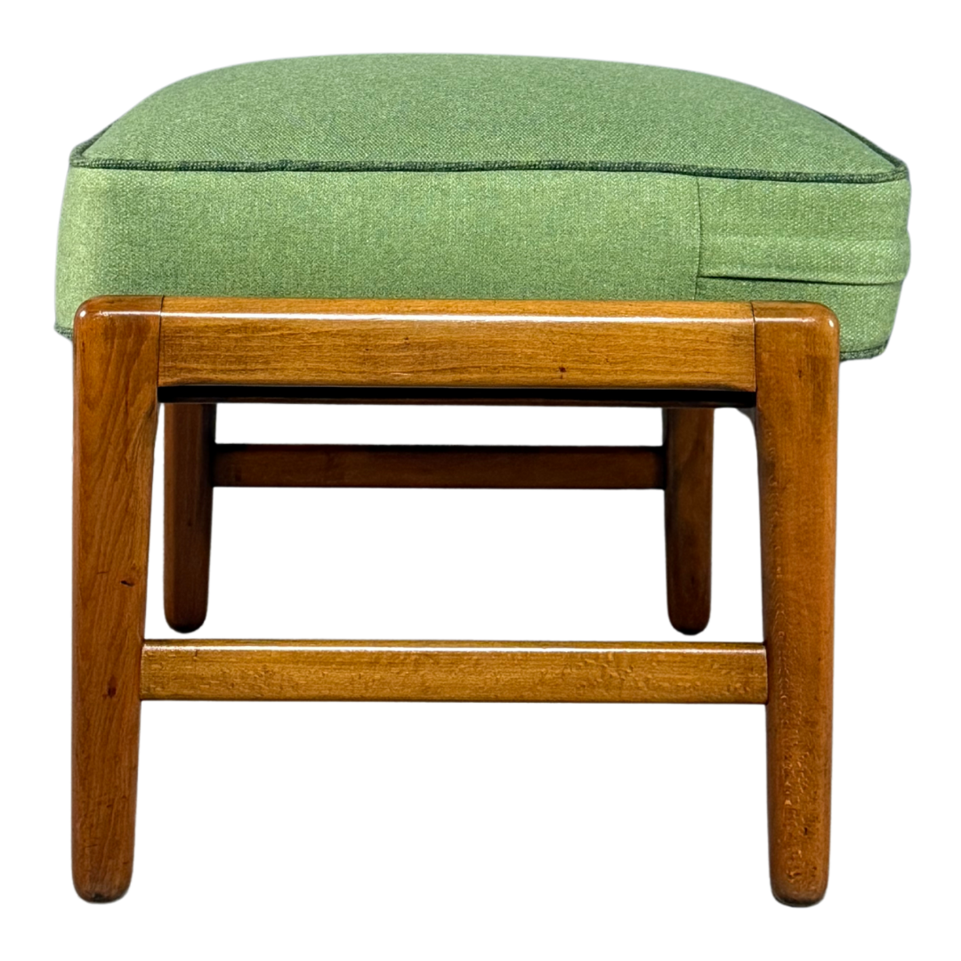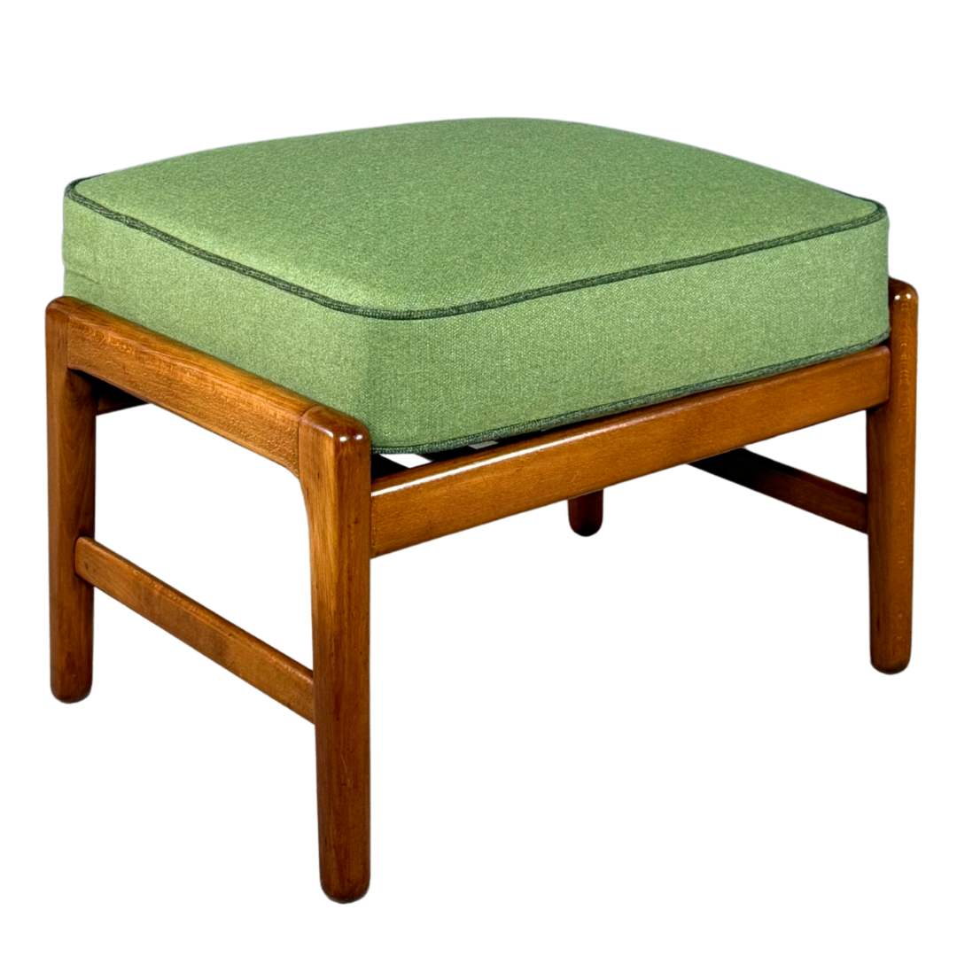 This is a GE 233 lounge chair and ottoman, designed by Hans J. Wegner for Getama (Gedsted, Denmark) in the 1950s, a period when Wegner was refining his concept of relaxed, human-centered modernism, pared down to essentials but full of subtle ergonomics. Wide paddle arms, angled back and deep seat in solid oakwood. Matching footstool. Recently upholstered in contrasting green wool. Designed in 1952.