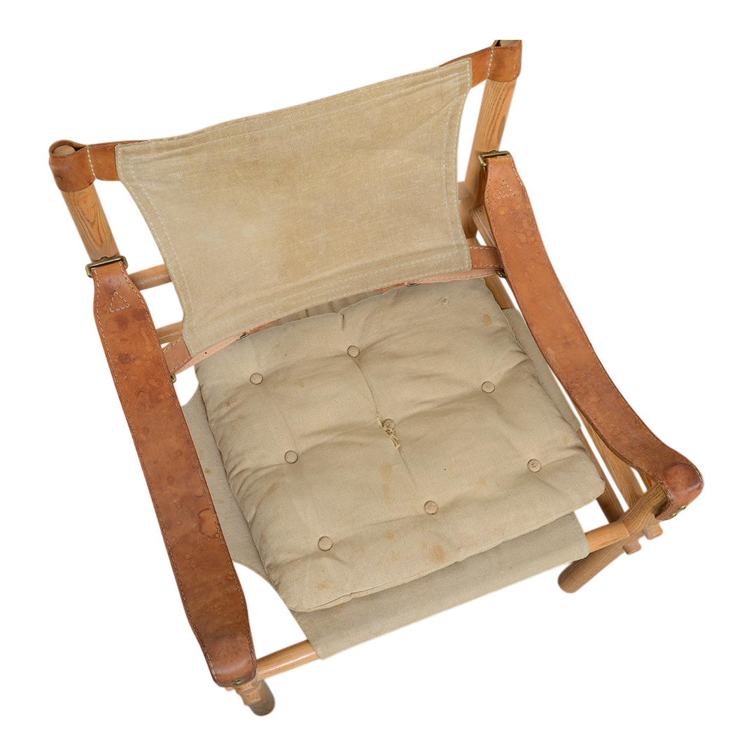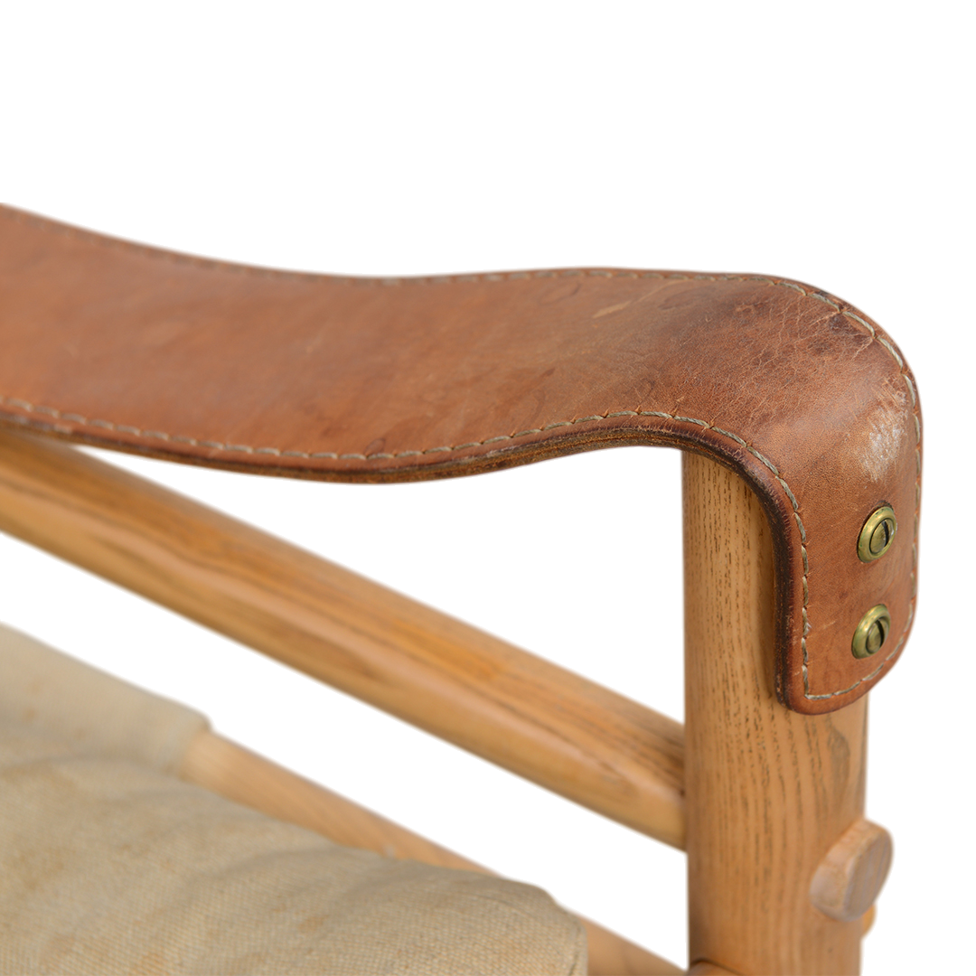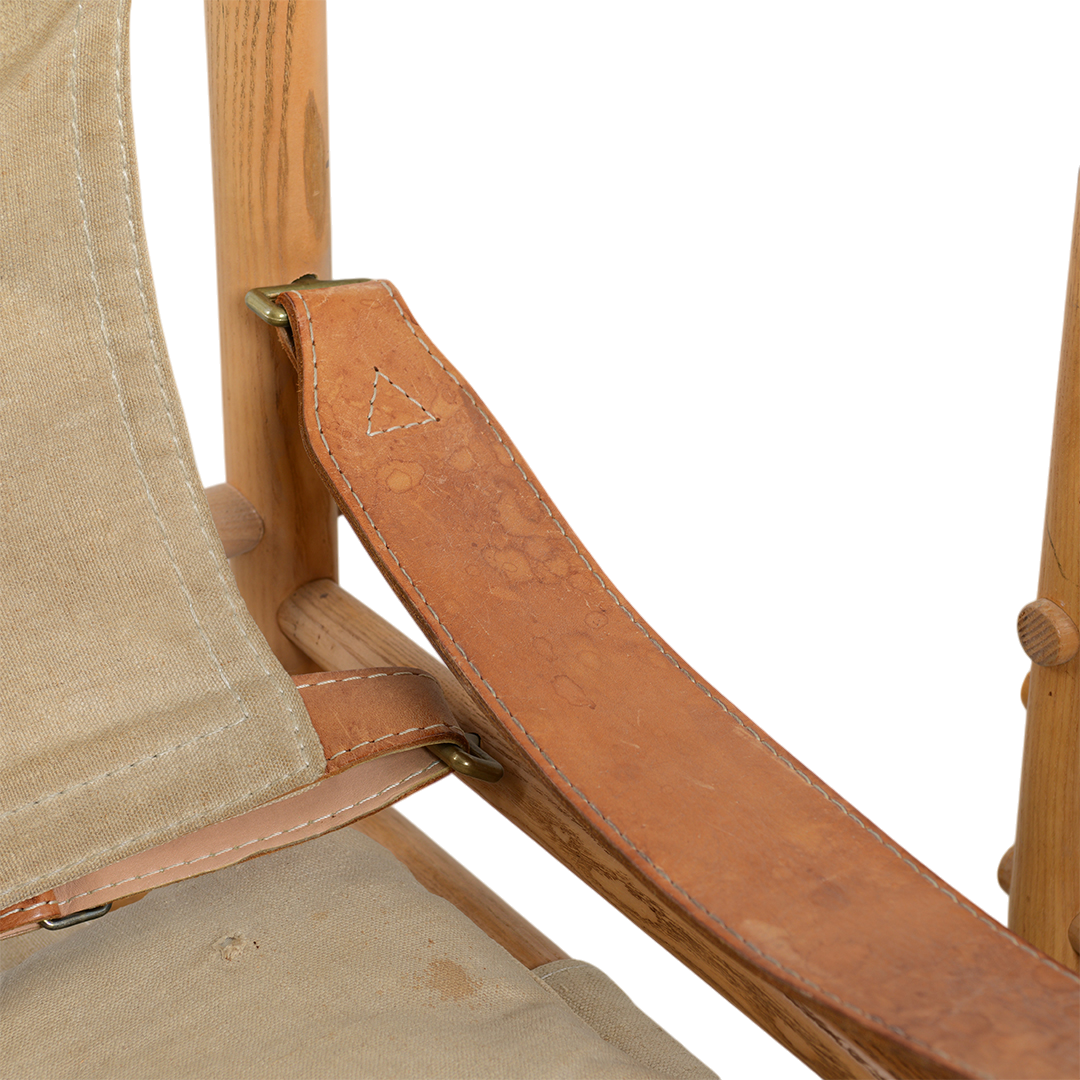 The safari chair tradition with a nod to the British military need for self-assembly found a most ardent follower in Arne Norell (1917-1971) who designed the Sirocco in 1964. Classic use of beautifully stitched heavy canvas strapped to a pegged ashwood frame without the use of glue or screws. Produced by Norell Möbel AB in Småland, Sweden. Late production.