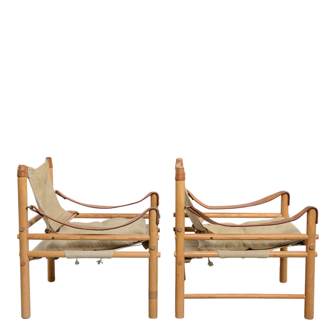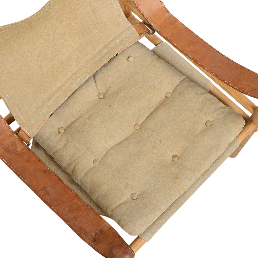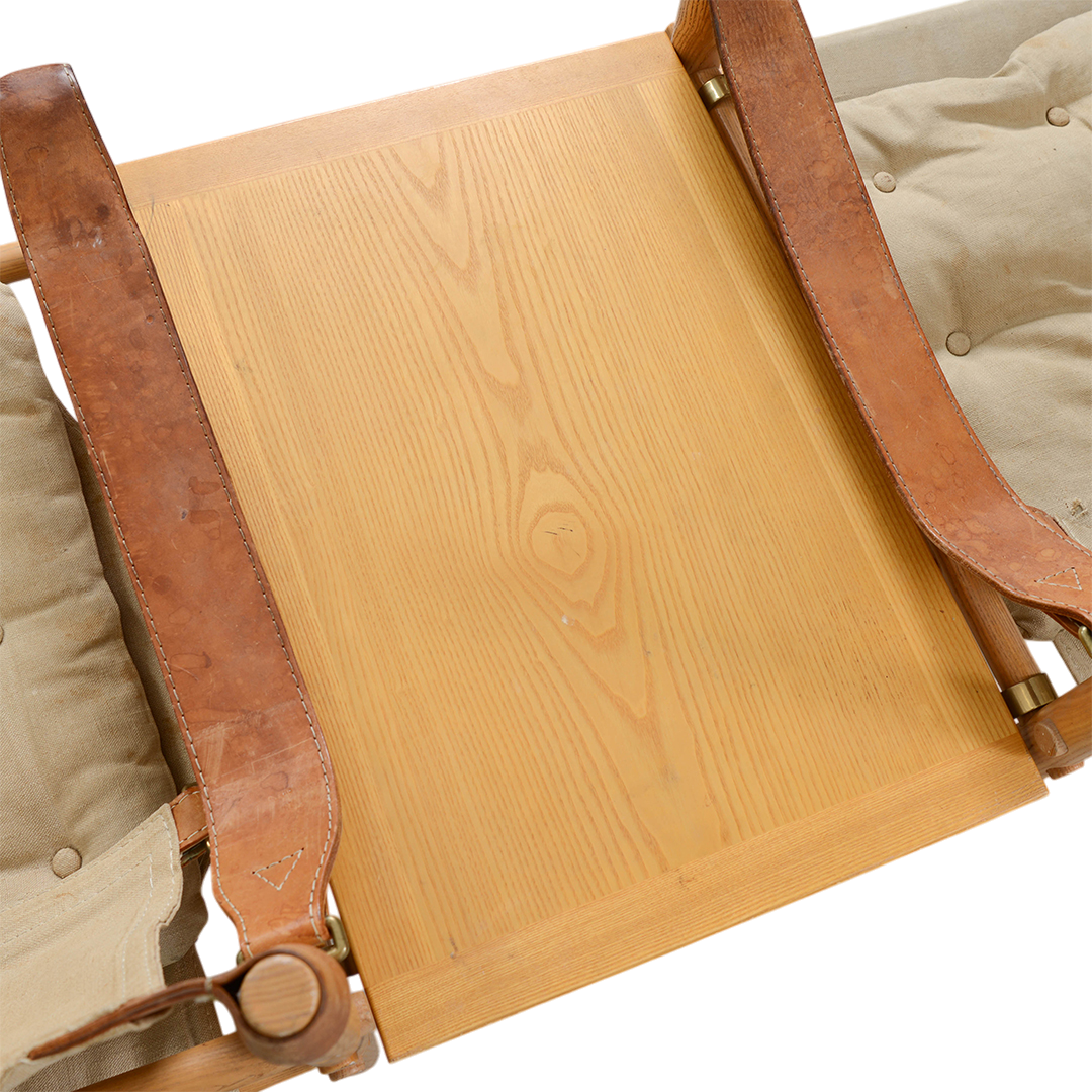 The safari chair tradition with a nod to the British military need for self-assembly found a most ardent follower in Arne Norell (1917-1971) who designed the Sirocco in 1964. Classic use of beautifully stitched heavy canvas strapped to a pegged ashwood frame without the use of glue or screws. Produced by Norell Möbel AB in Småland, Sweden. Late production.