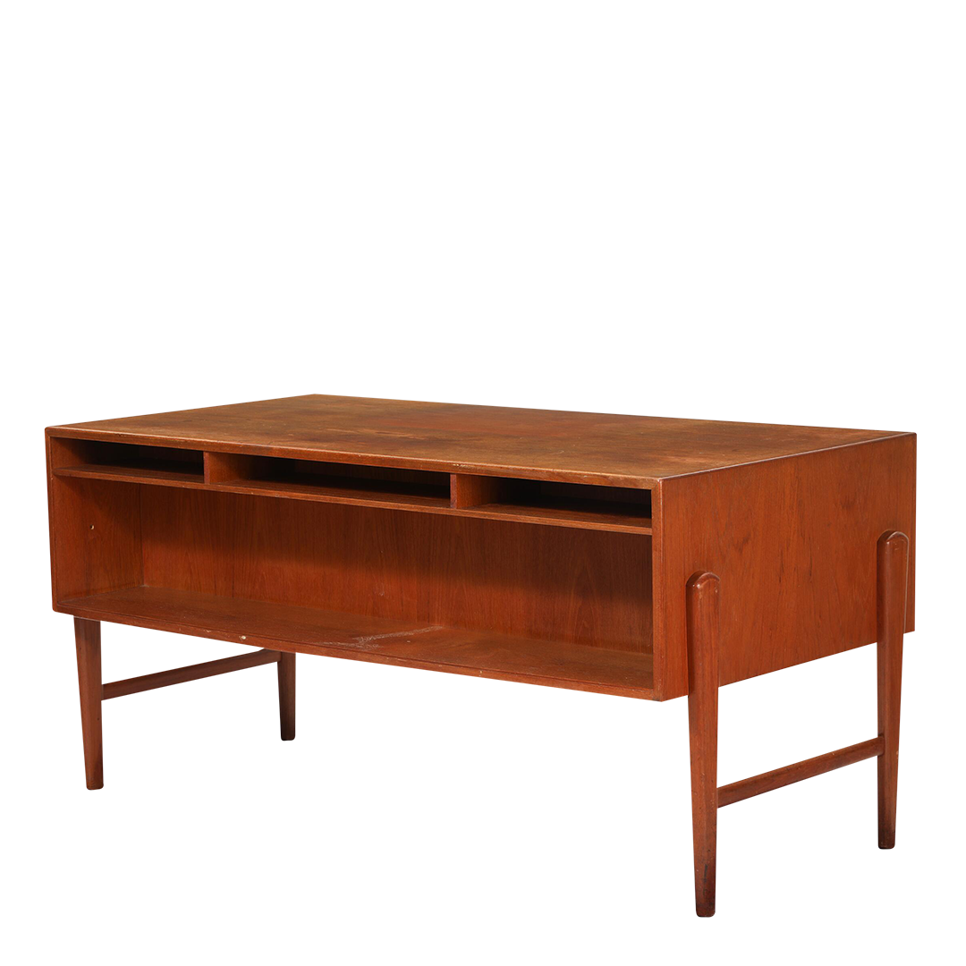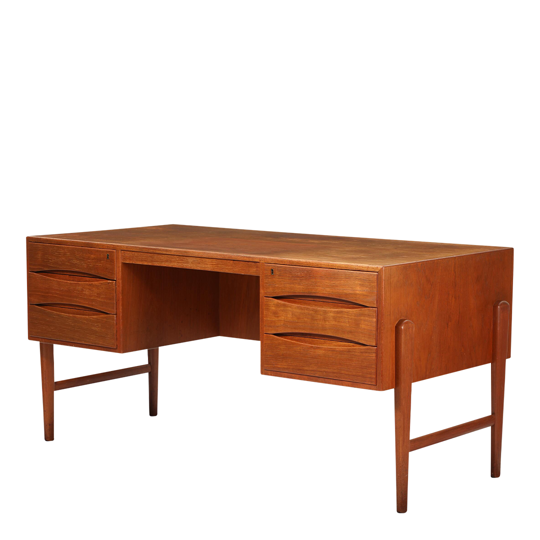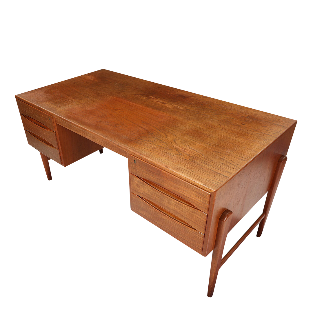 Following a classic mid-century Scandinavian design aesthetic - this teakwood desk has a square form with a pair of 3-drawer cases to both sides with alternating integrated pulls. Visible side legs with lower stretcher. Produced in the 1960s outside of Denmark.