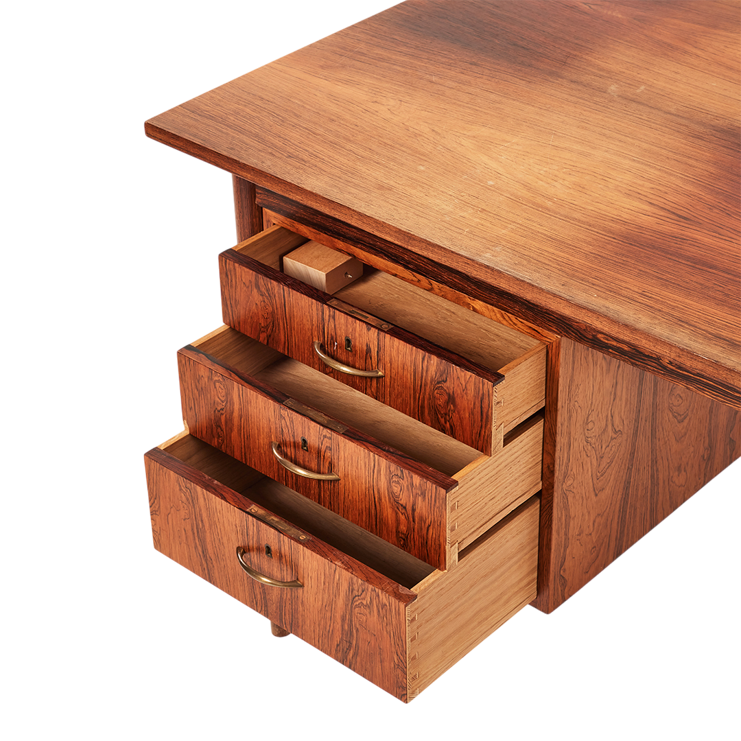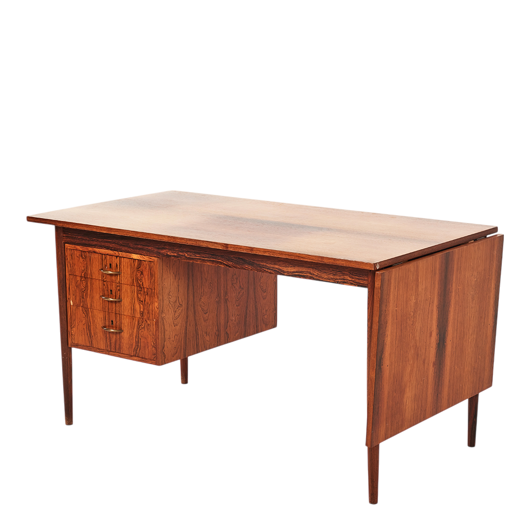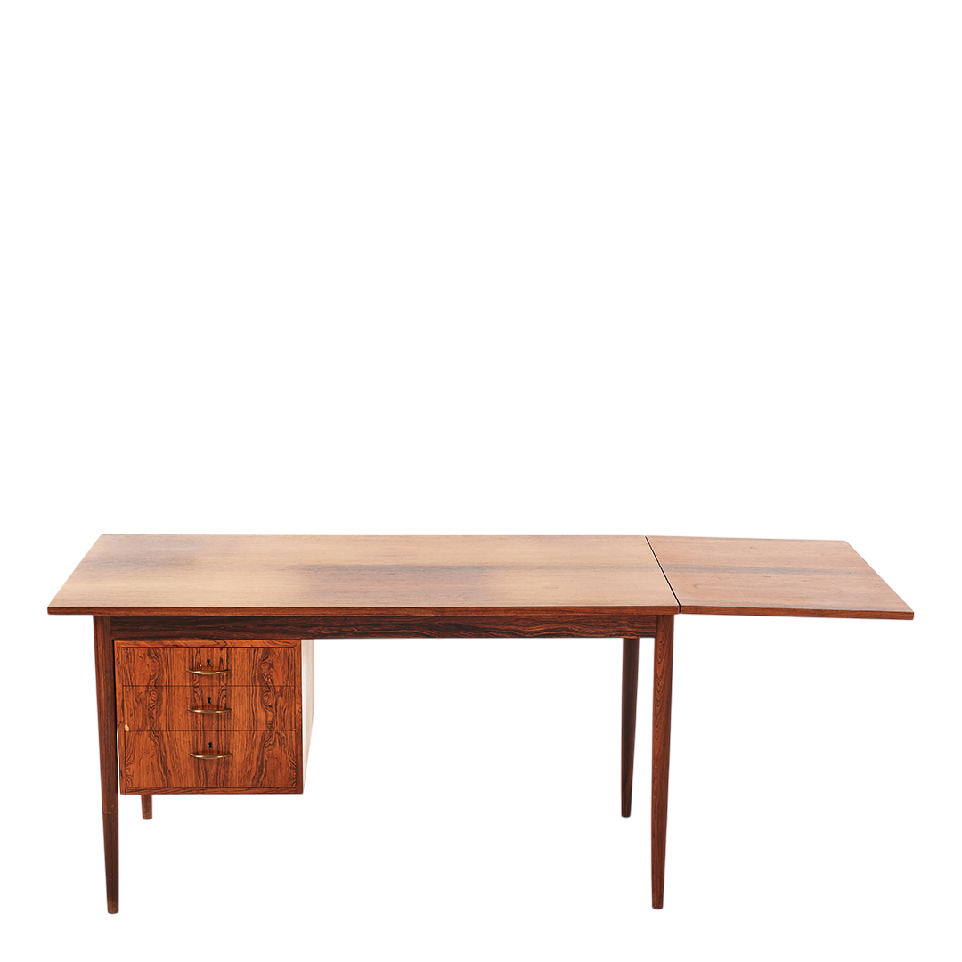 There are no makers marks to this desk - so unclear about manufacture - however certainly Danish modern design from the 1960s. Constructed in a rich Brazilian rosewood veneer overall. Three left-side drawers extend the full depth of the desk with simple arched brass pulls. The 52" primary desk top can be increased with a side piece that adds another 20" as needed. The price includes restoration of the finish.