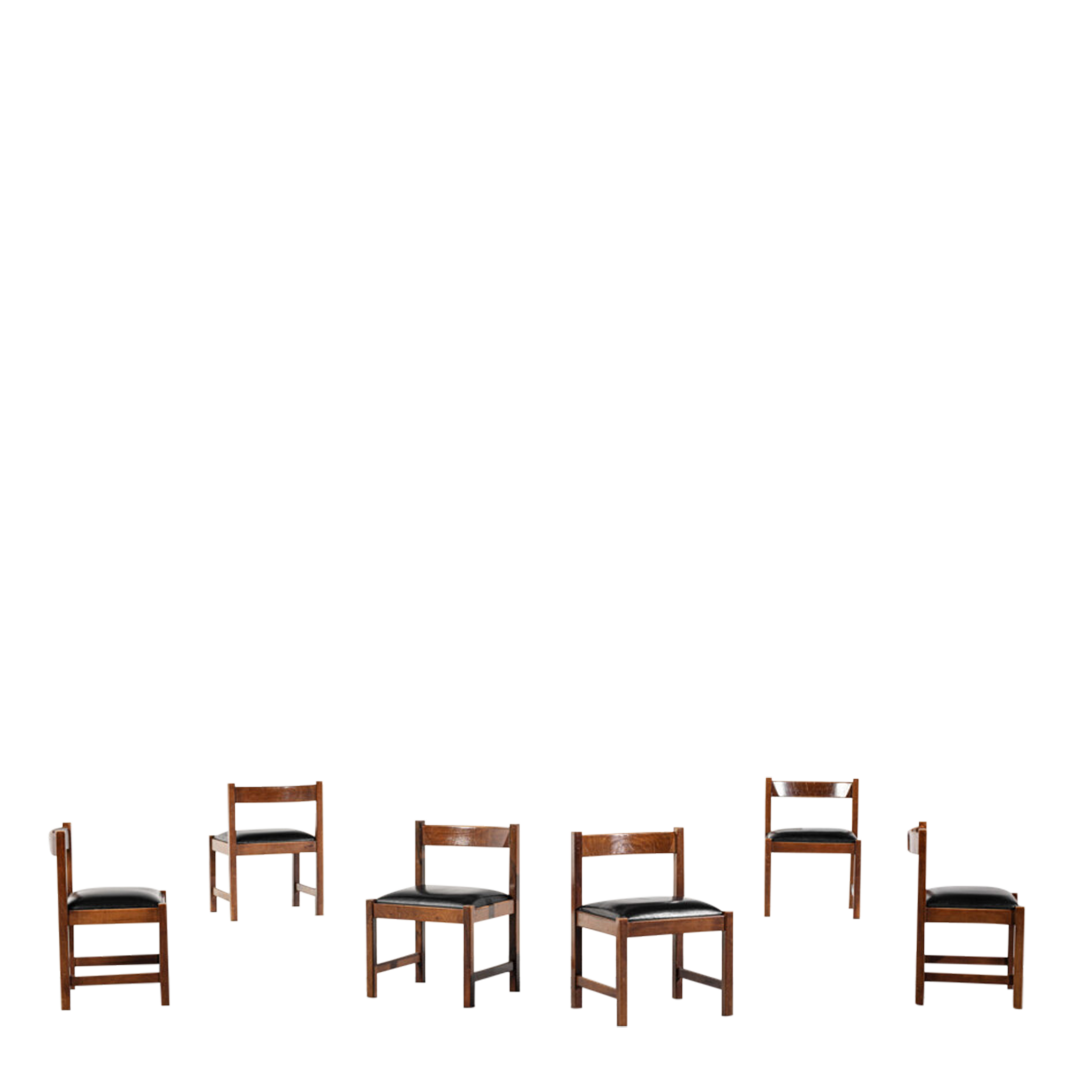 Italian architect Giovanni Michelucci (1891-1990) was an early proponent of the Rationalist movement blending modernity with classical proportion. He was one of Italy's most influential architects and educators in Florence. This set of six dining chairs has perfectly proportioned dark-stained walnut frame and square legs. A nicely curved and elegant back rest with padded black leatherette seating. Model "Torbecchia" from Michelucci's hometown near Pistoia. Produced by Poltronova in Florence, 1960s. Set of six. Chairs have been refinished since images posted online.