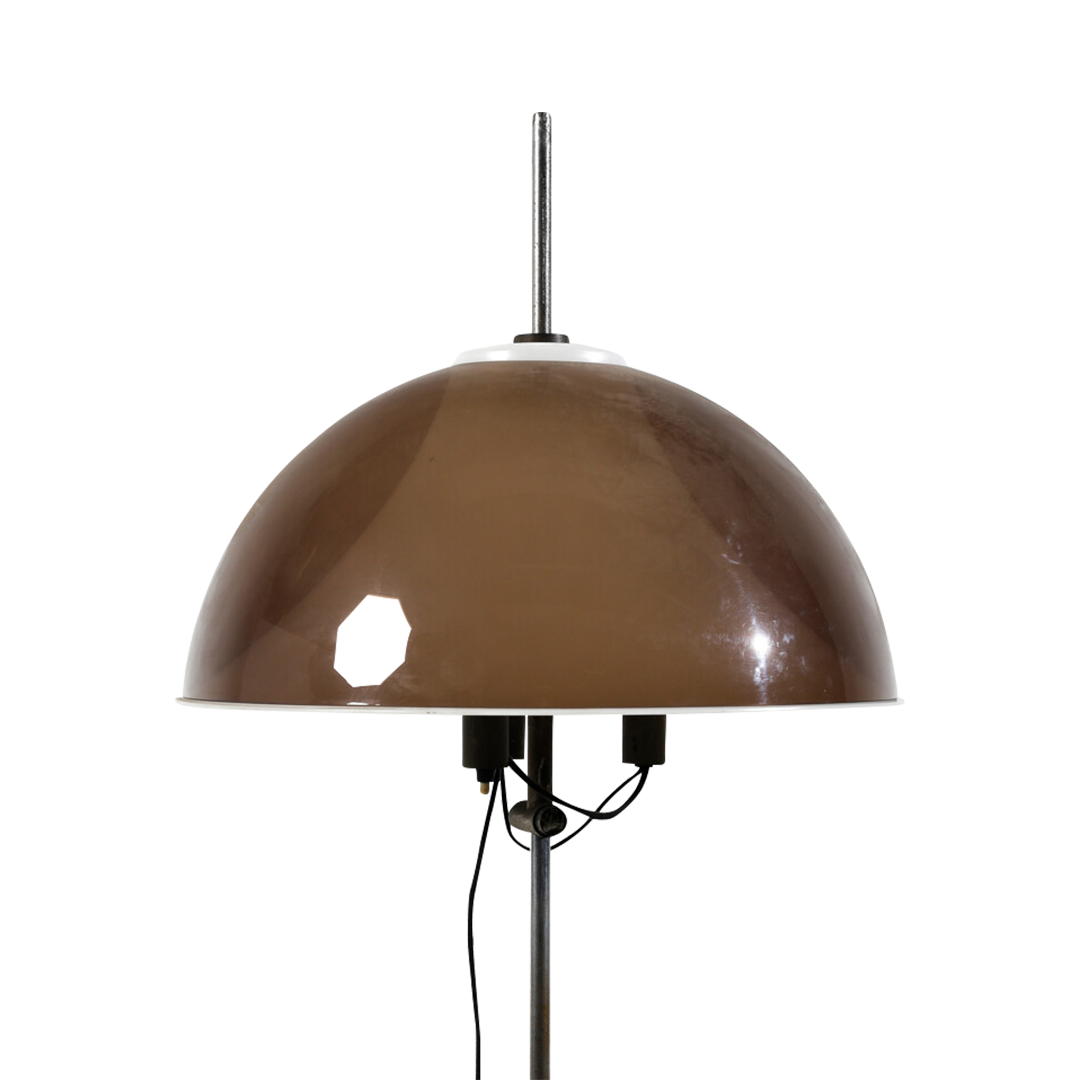 A wonderful Italian design floor lamp from the 1960s. Slender steel stem supported by blackened steel circular base. Three bulb brass fixture is hidden behind a lightweight and versatile 17.7" diameter Perspex dome shade in bronze coloration. Unknown Italian manufacture.