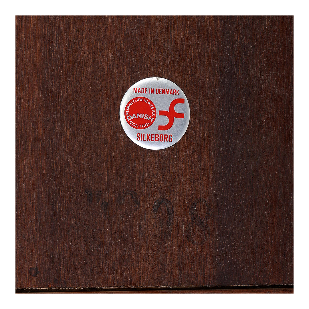 Danish cabinetmaker Johannes Andersen (1903-1991) trained as a traditional joiner, he opened his own workshop in the 1930s and later collaborated with several Danish manufacturers. This trolley comes from Andersen’s most prolific period, when he was producing refined, sculptural rosewood pieces for Silkeborg Møbelfabrik. This one with three tiers including a shorter shelf covered in black formica - and extended handles. Makers mark to underside.