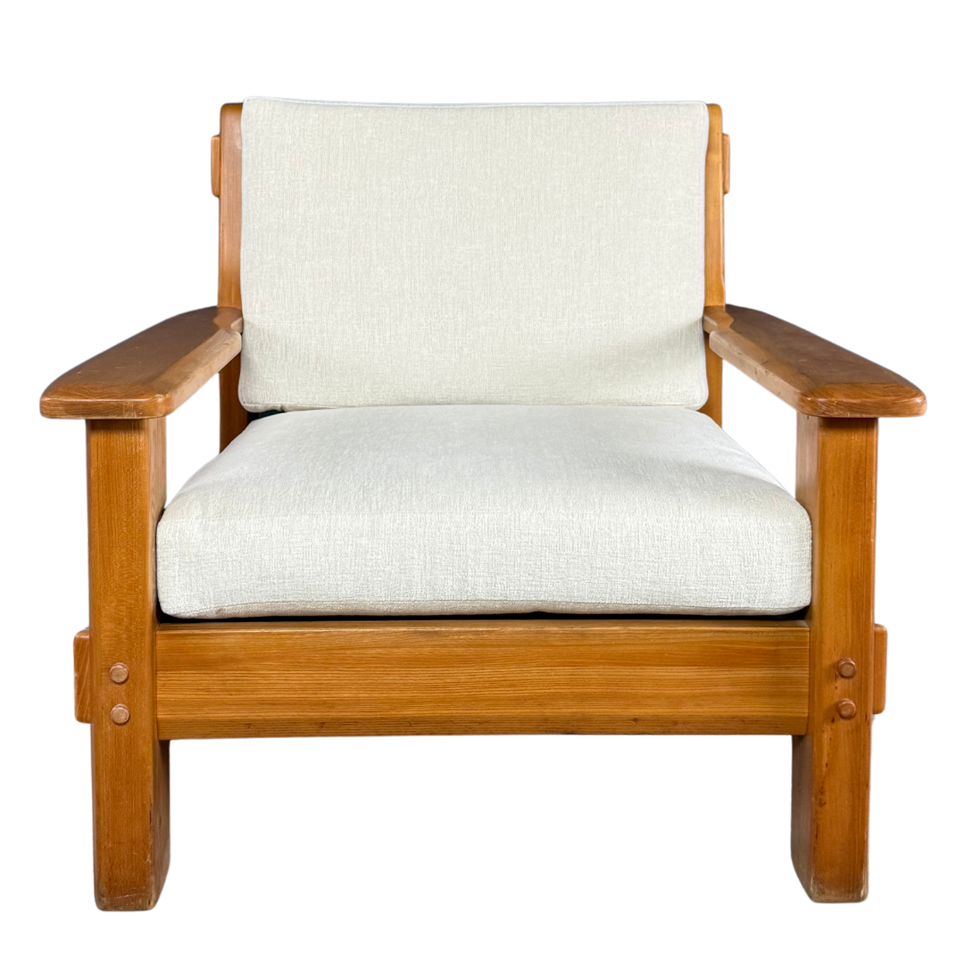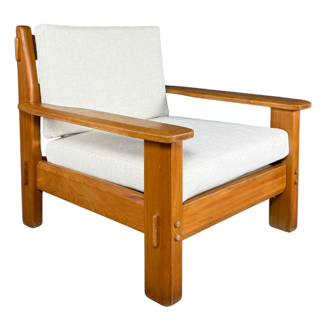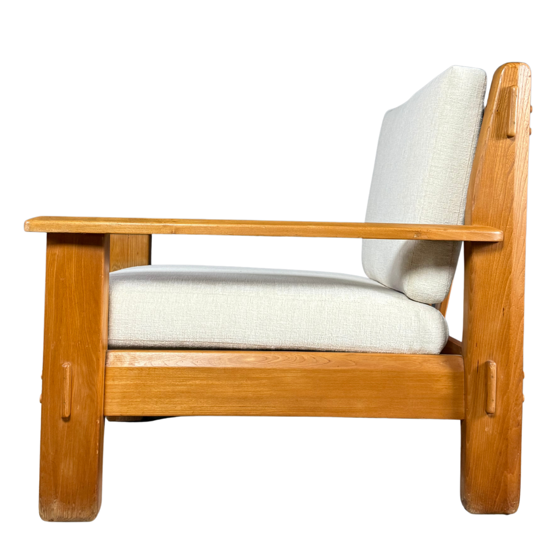 A very handsome lounge chair with solid oakwood frame and paddle arms in a warm honey finish that highlights the grain and durability of the wood. Slightly brutalist in design with exposed wooden dowels and pegs add a handcrafted touch, typical of French artisan woodworking of the period that was popular in French Alpine chalets. New cream upholstery.