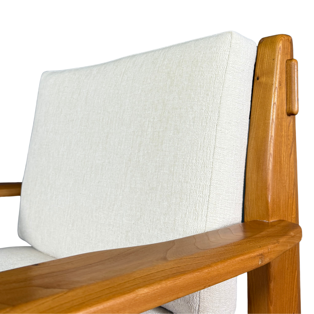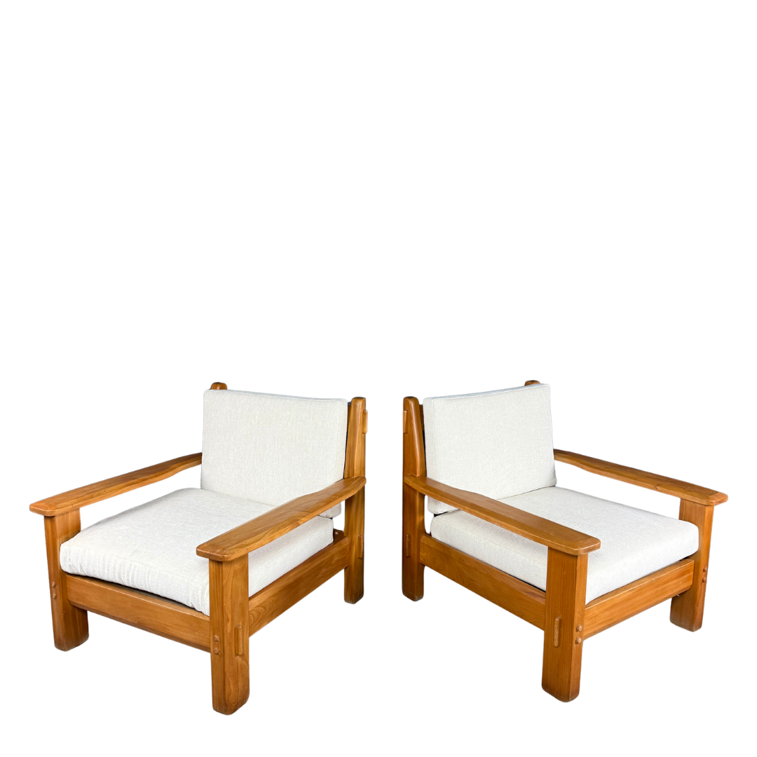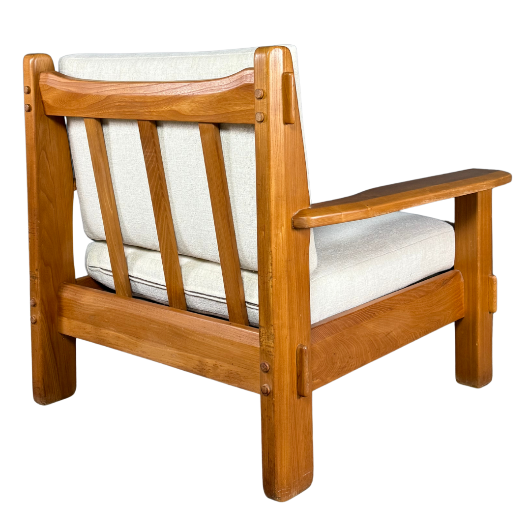 A very handsome lounge chair with solid oakwood frame and paddle arms in a warm honey finish that highlights the grain and durability of the wood. Slightly brutalist in design with exposed wooden dowels and pegs add a handcrafted touch, typical of French artisan woodworking of the period that was popular in French Alpine chalets. New cream upholstery.