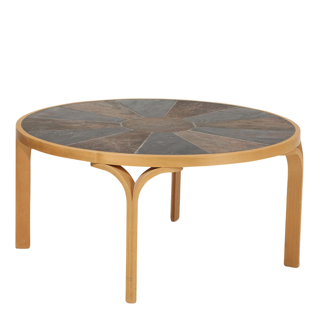 Haslev Møbelsnedkeri, founded in 1920s traditional wood craftsmanship - found exceptional growth in the Scandinavian modernist movement - particularly their collaborating with designer Severin Hansen and ceramics powerhouse Royal Copenhagen. This later coffee table has a radial inlay of natural slate tiles, forming a sunburst or starburst pattern - over a classic bent beechwood frame. Denmark.