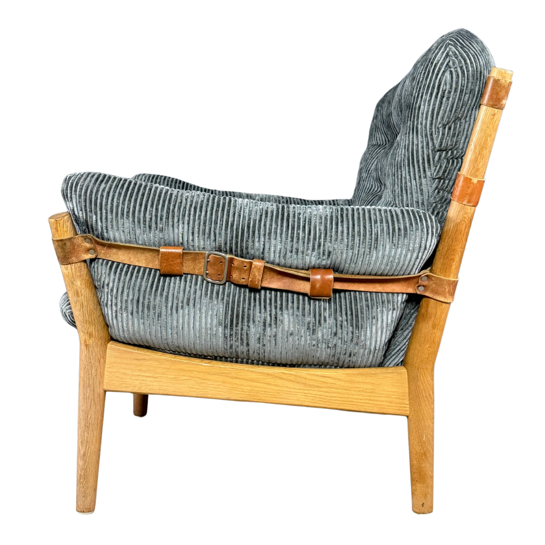 Easily one of John Mortensen’s most iconic early-1970s designs, exuding effortless cool. Constructed in a solid oakwood frame that sits low to the ground and slops gently outward. Four loose cushions in new grey corduroy upholstery that is held in place by leather strapping wrapped to the frame and supported by buckles. Sling suspension and strap detailing - what's not to love. Manufactured at Model 4521 by Magnus Olesen, Denmark.