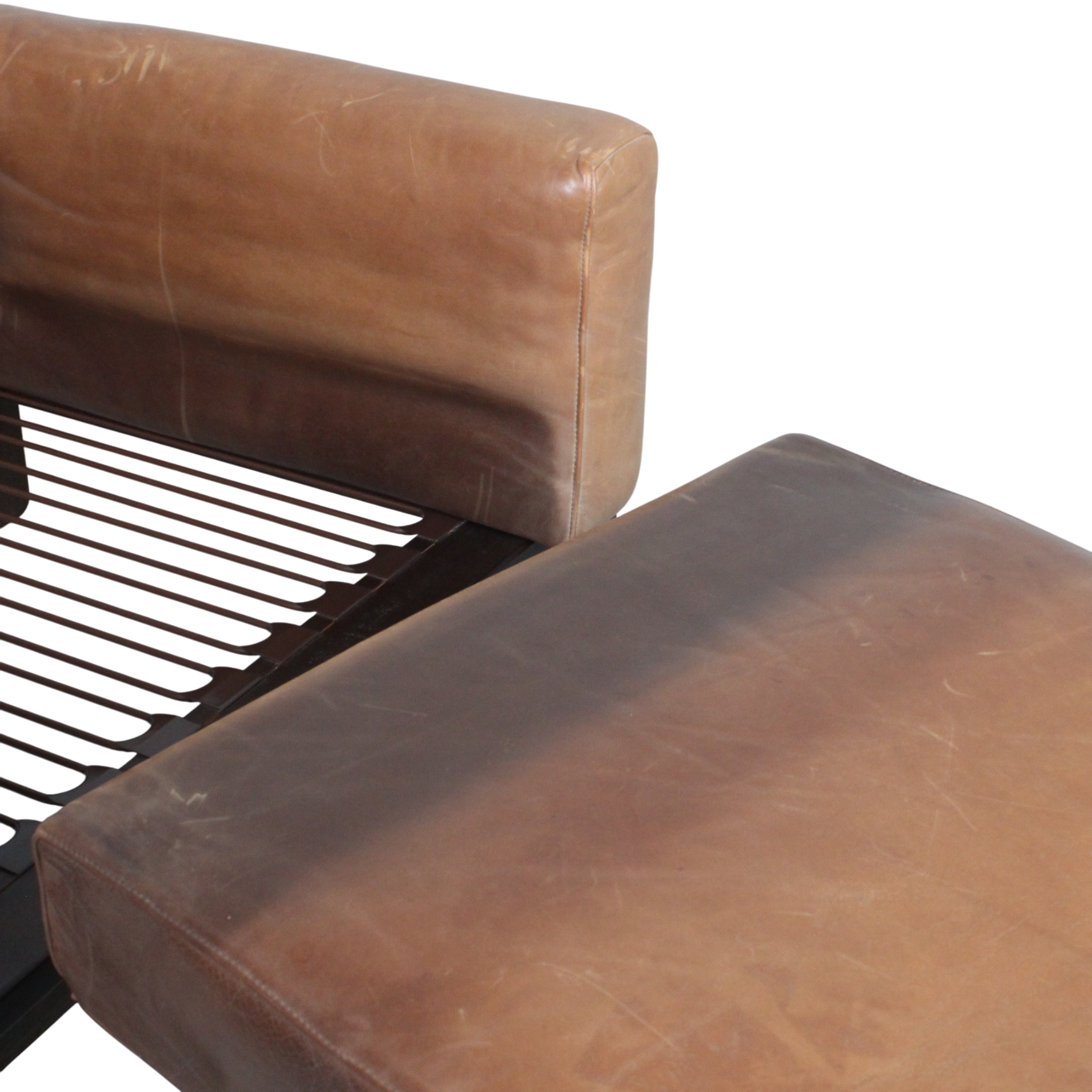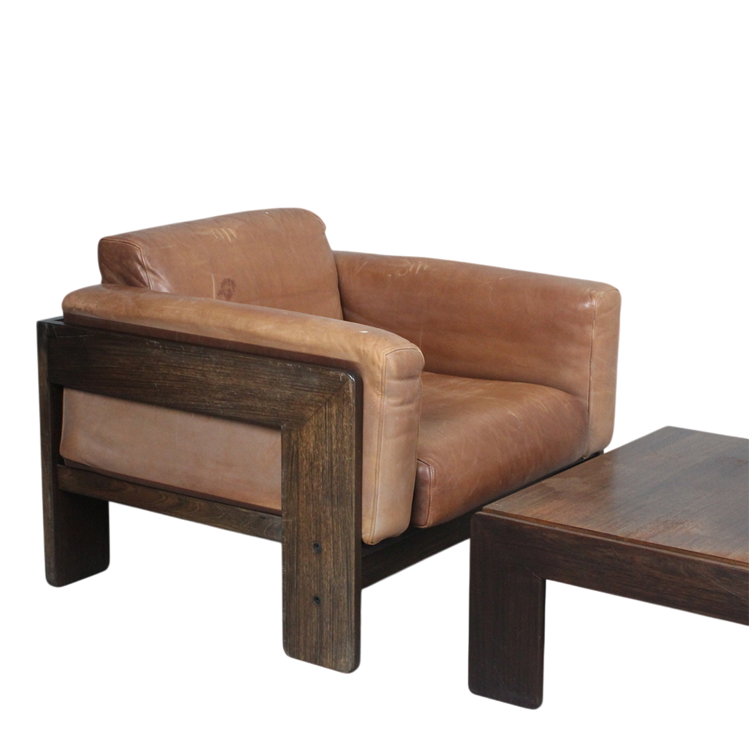 The Italian Compasso d’Oro award winning husband & wife team of Tobia and Afra Scarpa created multi-disciplinary designs in architecture, furniture, lighting and industrial design. Their work with Italian firm Gavina was avant-garde - including the "Bastiano" series starting in 1962. Low, deep and exceptionally comfortable. Square hardwood frames are beautifully stained - supporting sumptuous loose cognac leather cushions. The chair is likely produced in the 1970s after Gavina was purchased by Knoll, Italy. Table sold separately.