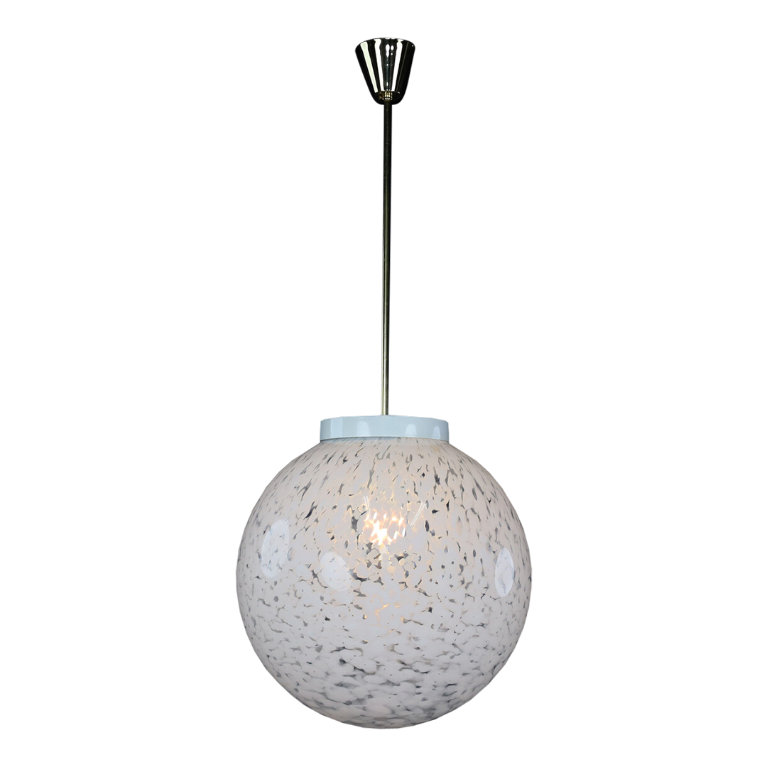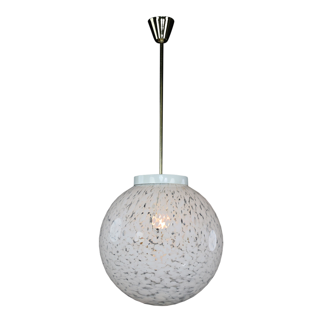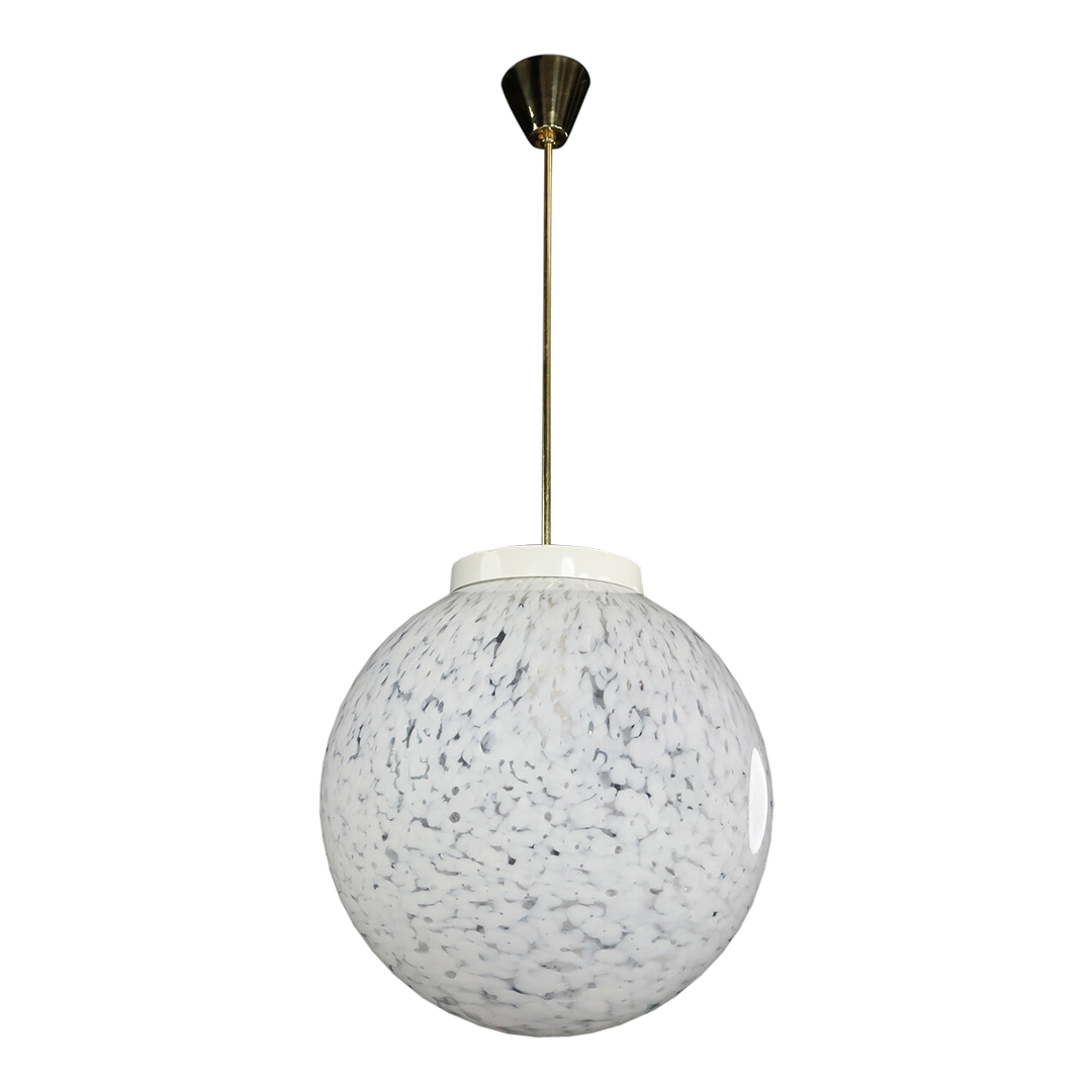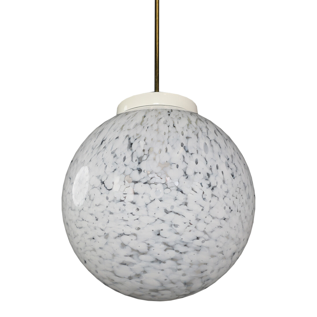 Produced in the wonderful glass blowing region of the Czech Republic in Bohemia, known as the crystal valley. This hanging pendant has a large 15.8" hand blown glass globe has mottled white cloud-like accents. White painted metal cap and a brass stem.
