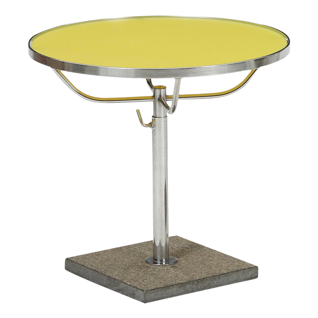 This 1980s DUX Design side table is a striking example of late modernist Swedish design with a playful pop of postmodern color. It features a circular top in bright yellow glass supported by four chrome arms and edged with polished chrome for a sleek, reflective finish. Adjustable height with central chrome pedestal anchored in a square solid granite base. 1980s DUX Design Team, Sweden.