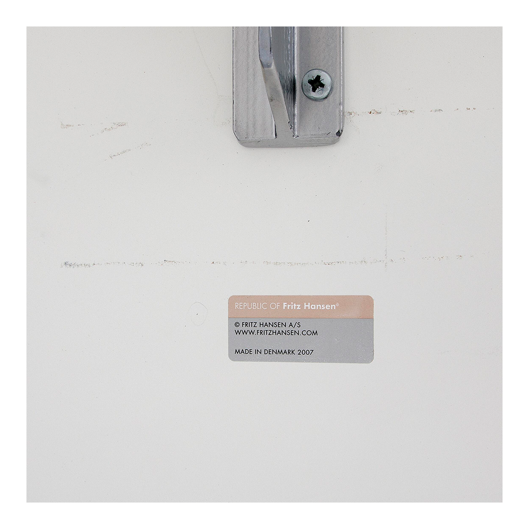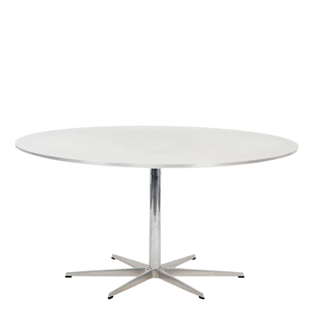 Arne Jacobsen (1902–1971) was a Danish architect and designer celebrated for pioneering modernist architecture and creating iconic furniture pieces. This Model A 826 table was conceived as a versatile table for dining rooms, meeting spaces, and cafeterias starting in 1969. The circular thin edge top is a white laminate and beautifully trimmed in aluminum. The classic six-star brushed aluminum base is supported by a chromed steel stem. Later production (2007) by Fritz Hansen, Denmark. Marked with original labels.