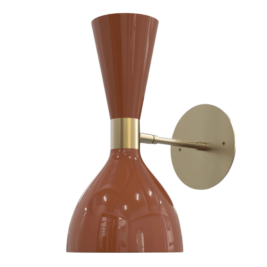 The Ludo Wall Sconce is a playful design scaled to work well in a breakfast nook, in a foyer, a forlorn corner, as a reading lamp, a bedside lamp or flanking a bathroom or powder room vanity. The perfect luxe addition to a master suite, nursery or glam room. Impactful in groupings or in pairs, but sculptural enough to stand alone. The spun aluminum cones are a vintage 1950s Italian design. Swiveling head allows for cone adjustment. This design is strongly influenced by both French and Italian Mid-Century Modernism.