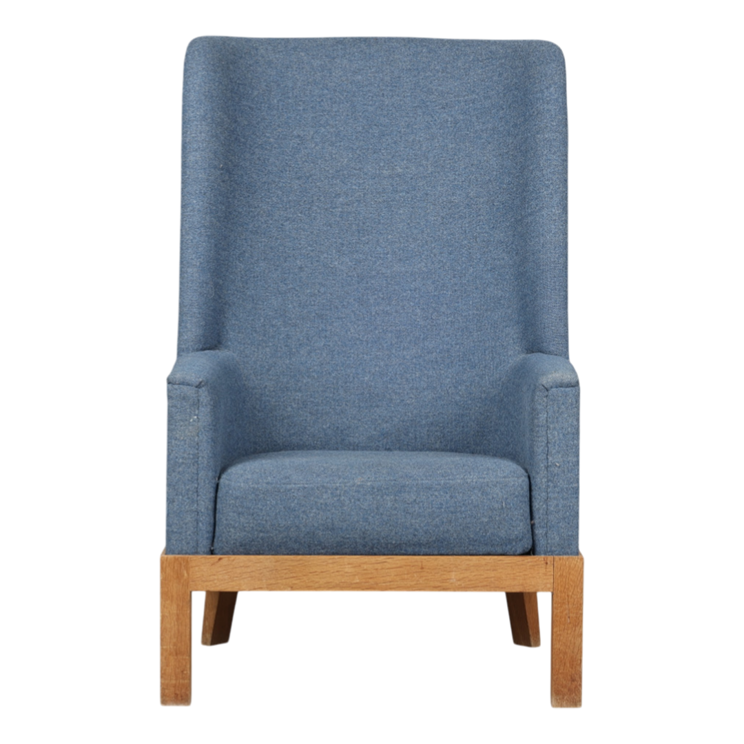 Another example of early 1940s Danish production that is not identified to any known manufacture or design and typical of the small pre-war workshops that operated throughout the country. This unusual armchair has a tall gently curved back and square upright integrated arms - all over a solid oakwood low frame. Beautiful blue wool upholstery in good condition.