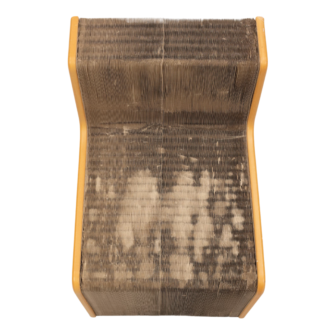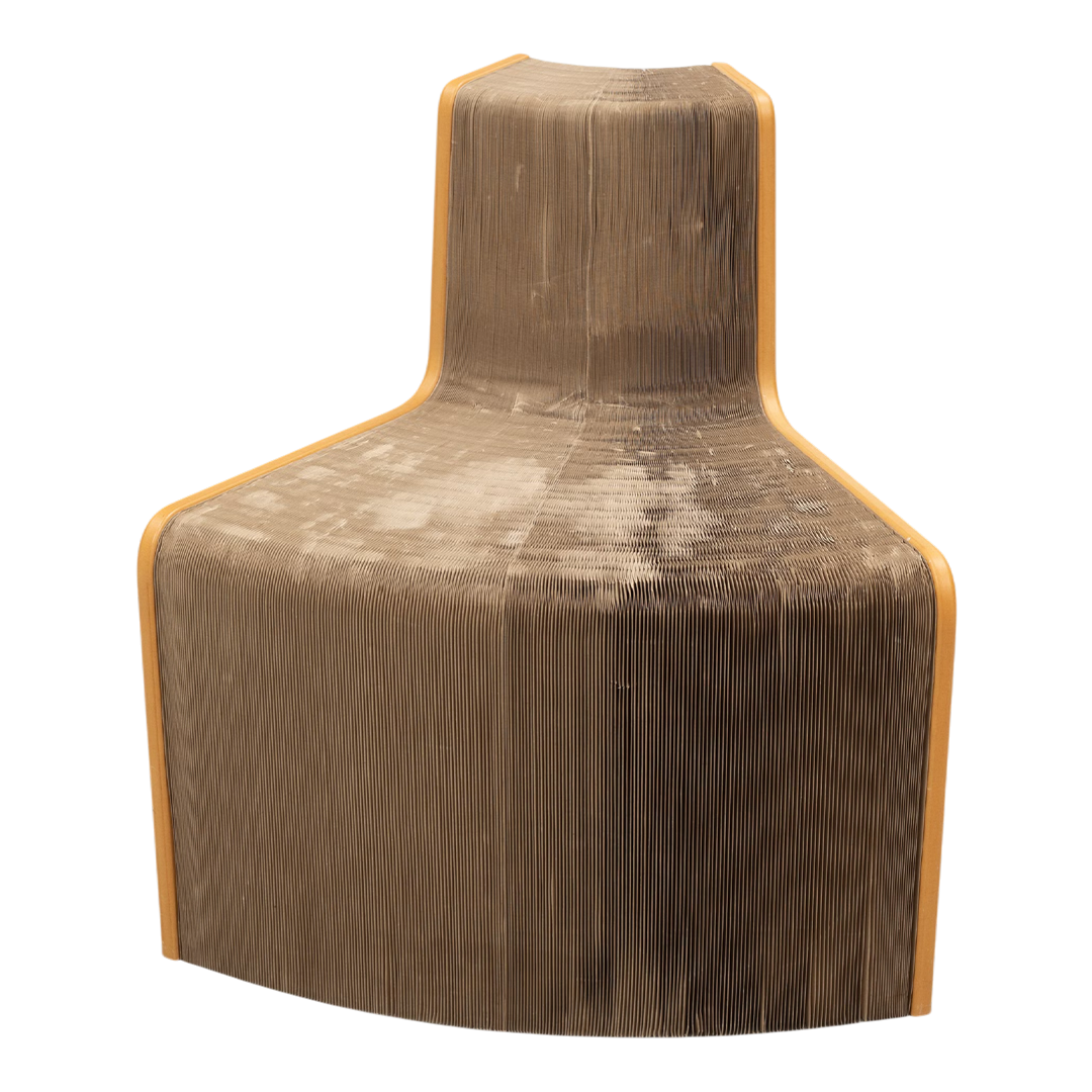 The Flexible Love chair was created in 2005 by Taiwanese designer Chishen Chiu, who was trained in both industrial design and architecture. Chiu was inspired by the structural properties of honeycomb cardboard, which he had encountered while working in a factory producing cardboard pallets. He saw potential for the material to be used in furniture that was transformable, portable, and sustainable. This chair is made from recycled paper and wood waste formed into a honeycomb structure, laminated for durability - with an accordion-fold feature that expands in a curve, functioning as a bench, chair, or even a sculptural seating element.