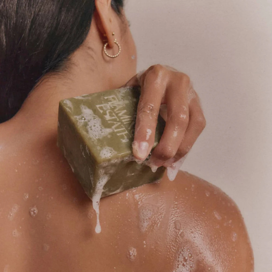 When this Soap Brick hits hot water, it fills the room with green steam and wakes up your brain. It smells like our Garden — herbaceous, unruly, and alive.