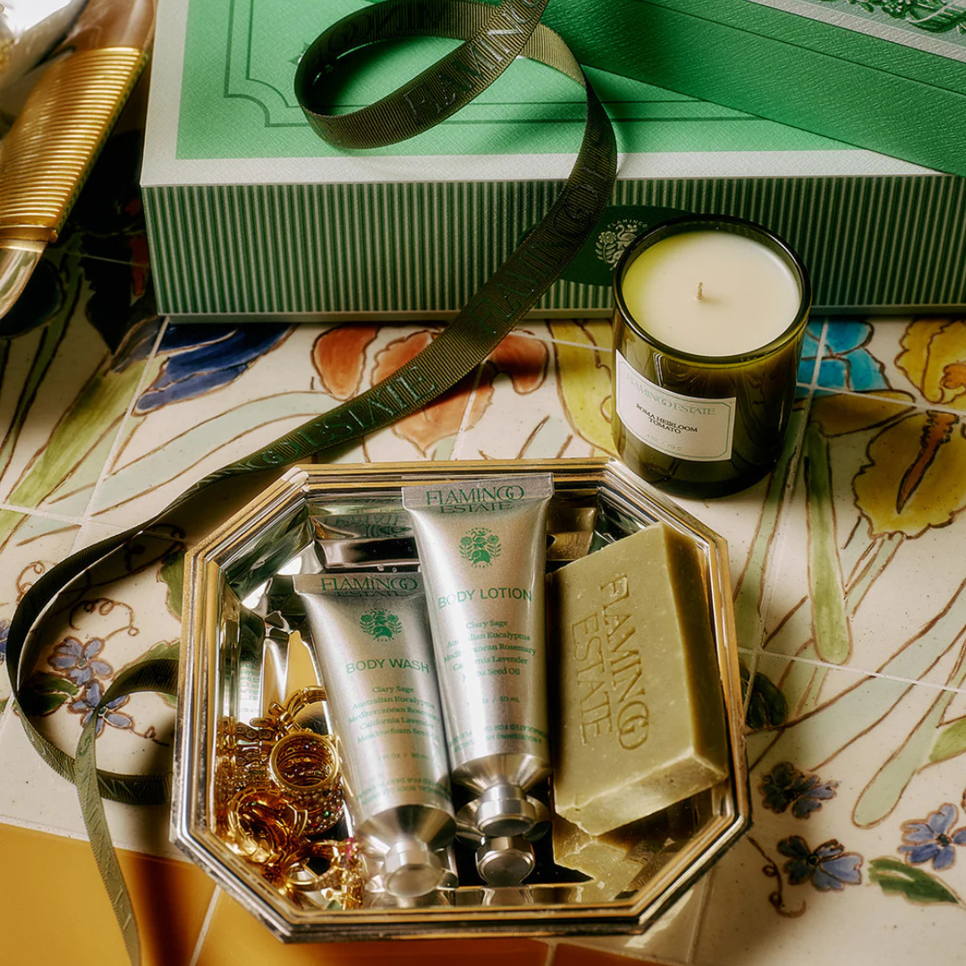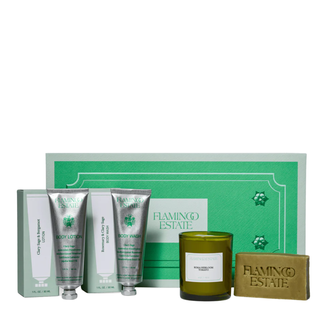 Take the garden on the road with a mini discovery set of Flamingo Estate's most loved products. It includes their favorite, most iconic bath and home essentials that started it all: A petite Sage & Bergamot Body Lotion, Sage & Rosemary Body Wash, Parsley & Rosemary Soap Bar, and Tomato Candle. It’s the perfect set to gift, take on vacation, or trial the brand for the first time. Above all, a complete bath ritual with the Estate’s most iconic scents & textures.