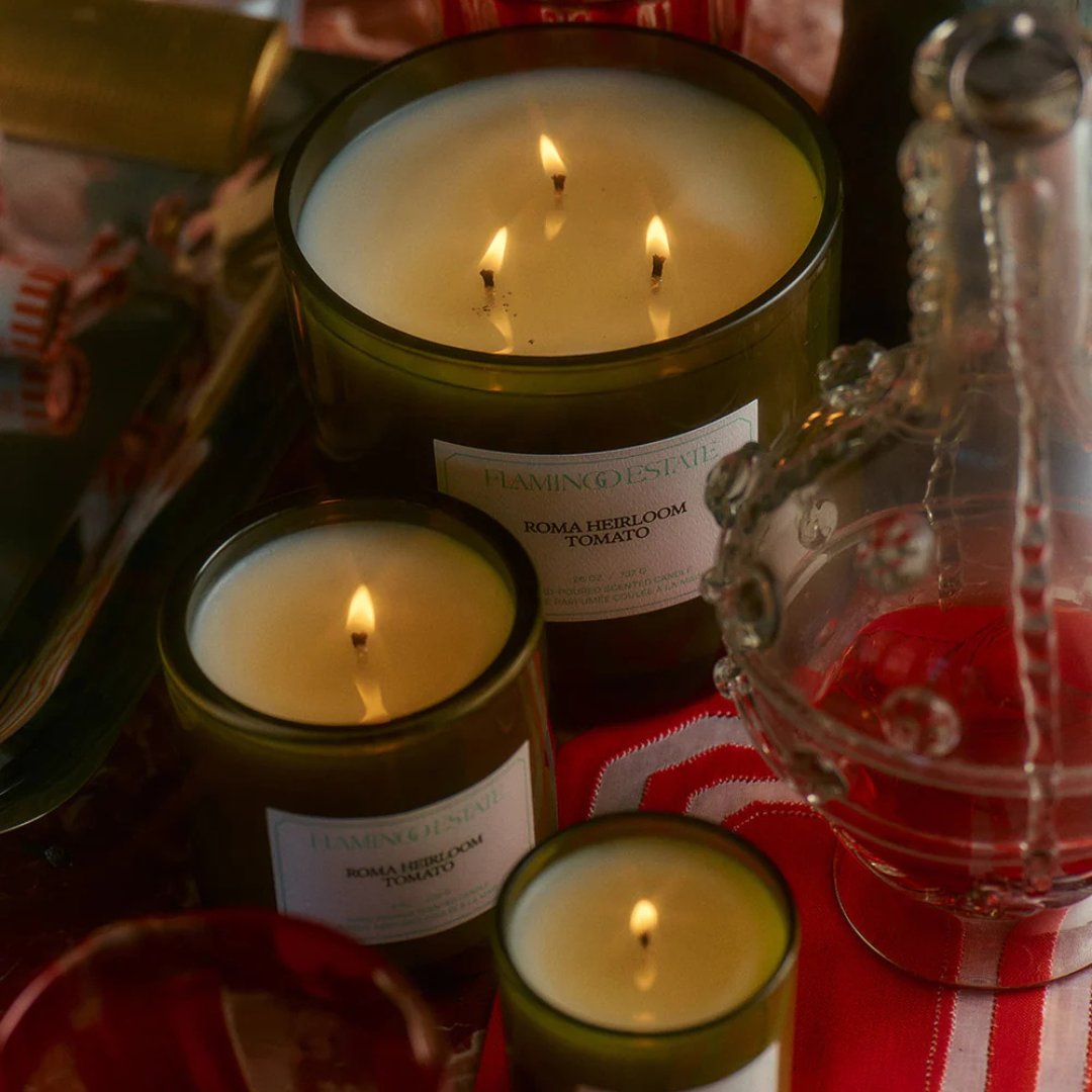 Flamingo Estate has taken their most famous product, more than tripled it in size, and hand-wrapped it in a beautiful custom Gift Box. The result is a universe of Tomato that casts a heavyweight scent into all corners of the home — carrying with it the aroma of balmy Summer nights in the Flamingo Estate garden, where the most unique, herbaceous scent runs down the terrace and tickles the nose. Our XL Candle has been hand-poured in an oversized, hand-blown glass vessel that’s triple-wicked and ready to burn for weeks.