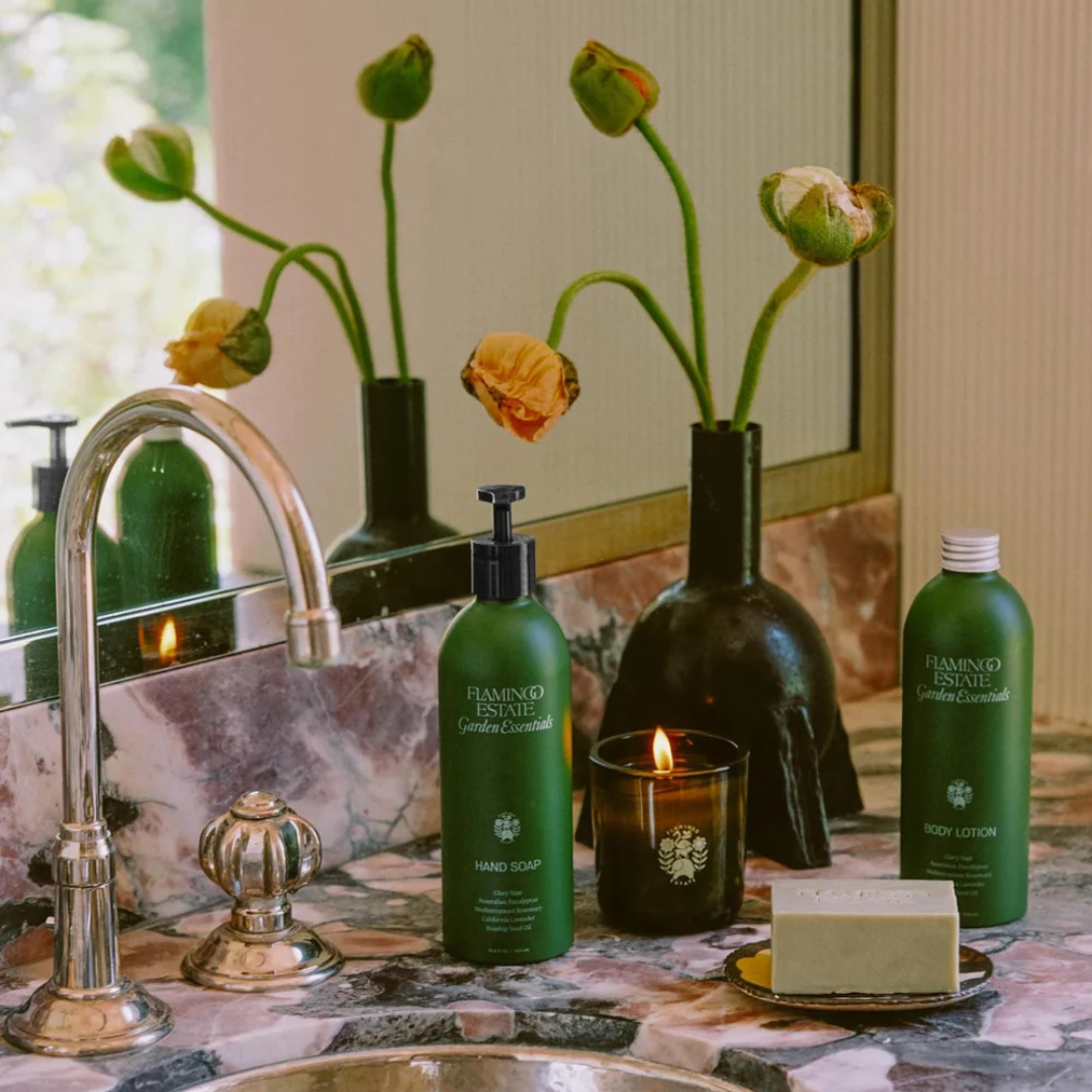 Composition: 100% Essential Oil fragrance of Clary Sage, Australian Eucalyptus, Mediterranean Rosemary, and California Lavender. The aroma of our Hand Soap is camphorous and awakening — inspired by the verdant gardens of Flamingo Estate.