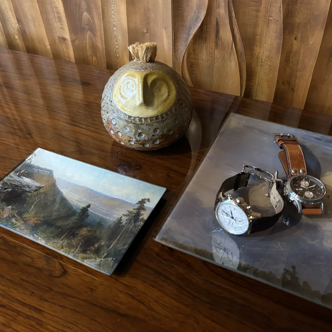 John Derian decoupage: is collaged paper under handblown glass in his studio in New York City, where he employs a small staff of artisans to assist with production.